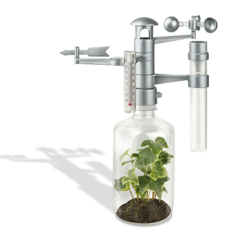 Kit scientifique station météo Observe et note le temps qu’il fait avec ta propre station météo multifonctions. Le kit contient une girouette, un anémomètre, un thermomètre et un pluviomètre. Il permet aussi d’expérimenter l’effet de serre et de réaliser un terrarium dans une bouteille. Pour enfants à partir de 8 ans. Avertissement : risque d’étouffement, petites pièces ; interdit aux enfants de moins de 3 ans. Bouteille non fournie.