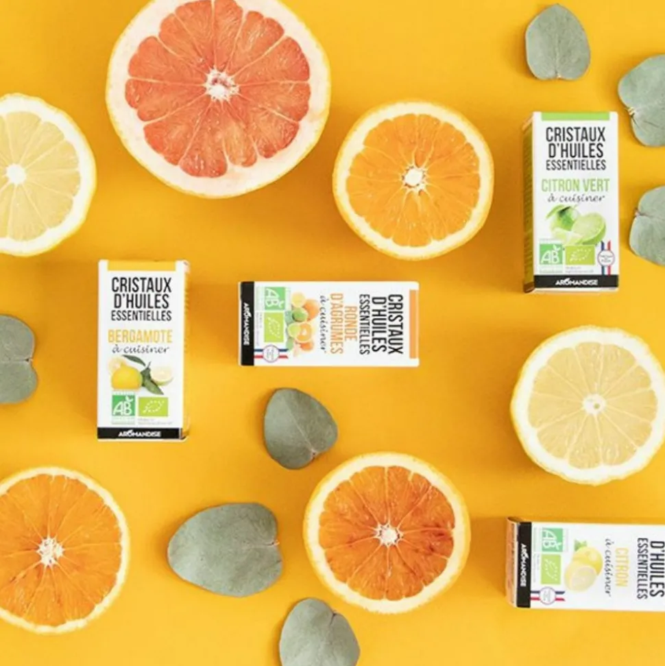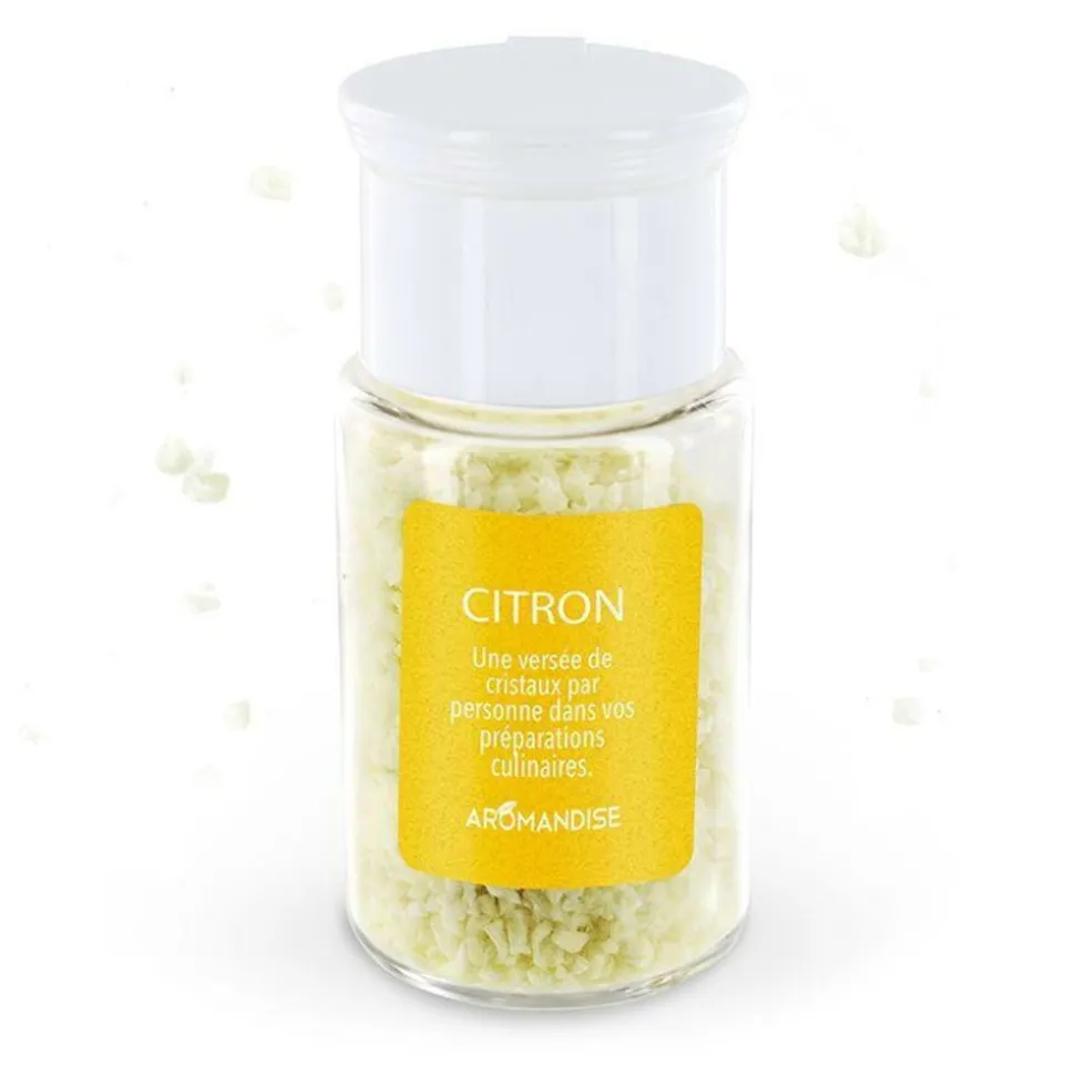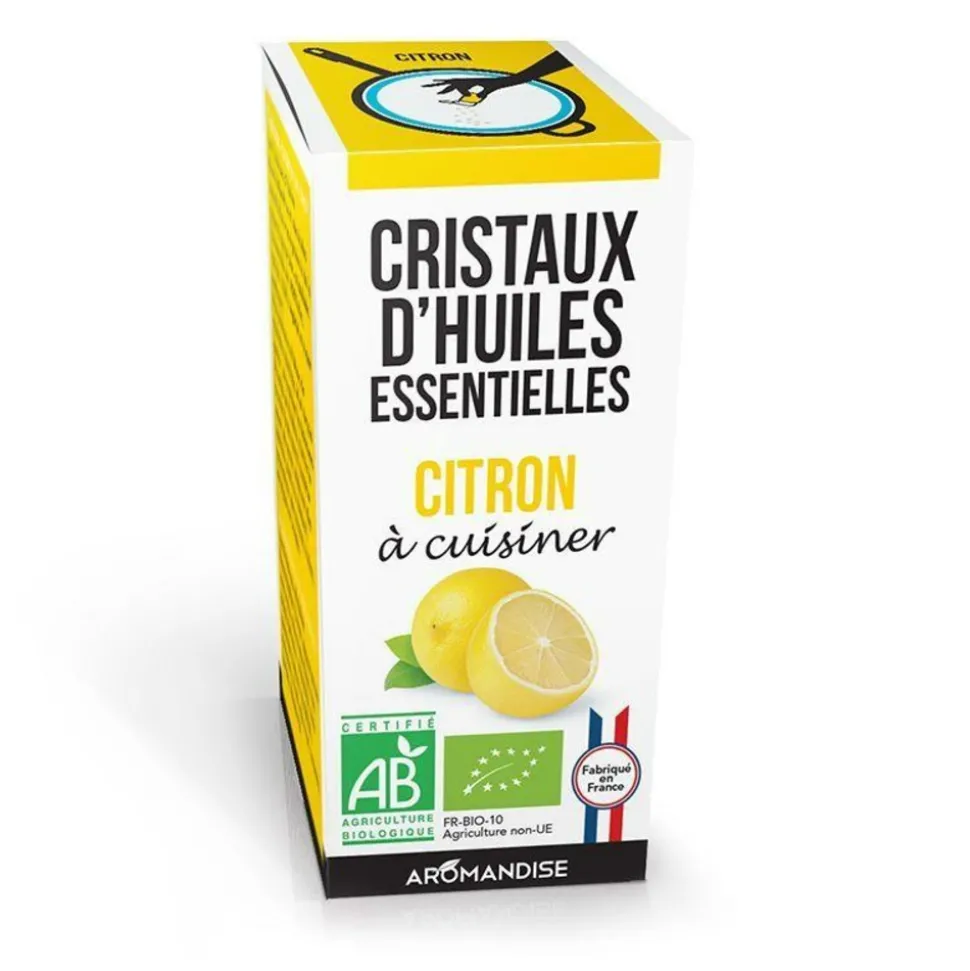 Pour retrouver toutes les saveurs du citron dans votre cuisine en quelques pincées! Les cristaux d’huiles essentielles résistent à la cuisson et vous pouvez les utiliser dans différentes préparations comme vos poissons, fruits de mer, sauces, tartes, desserts. Les Cristaux d’Huiles Essentielles sont des huiles essentielles imprégnées à de la pulpe d’agave bleu cristallisée. Ils sont biologique et d’origine 100% naturelle. Conseil d’utilisation : 1 versée correspond à une portion par personne. Les cristaux d’huile essentielle sont concentrés, il faut donc les doser légèrement. Elle équivaut au zeste d’une rondelle de citron. Ingrédients : poudre d’agave tequilana*, huile essentielle de citron* (Citrus limomum, zeste). (* Produit issu de l’agriculture biologique.)