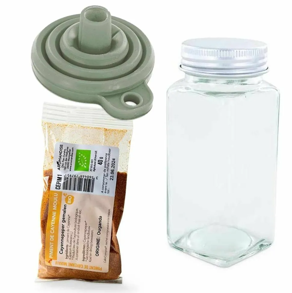 Piment de Cayenne moulu bio 40 g avec flacon poudreur et entonnoir. Le paprika moulu biologique est conditionné en sachet dégradable CelloCompost, une protection transparente biosourcée à partir de cellules végétales, dégradable en 90 jours ! Le sachet d’épices comprend une étiquette en papier repositionnable à coller : transvasez les épices dans le flacon poudreur grâce à l’entonnoir, puis collez l’étiquette dessus. Le flacon en verre durable avec bouchon en aluminium comprend une grille recyclable multi-usages. Sa forme carrée permet de gagner de la place dans les placards. Hauteur 10,5 cm, largeur 4,5 cm, contenance 120 ml. L’entonnoir en silicone est lavable facilement. Sa forme évasée permet de verser les épices facilement dans le flacon. En silicone, l’entonnoir est pliable et occupe très peu de place dans les placards. Emballé dans une boîte en carton recyclé. Hauteur 7 cm, diamètre 7,5 cm.