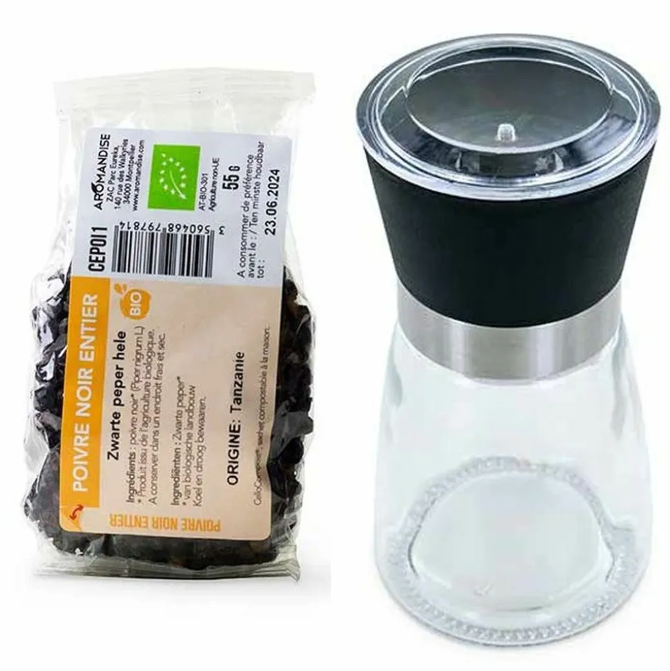 Moulin à poivre et poivre noir. Cet élégant moulin à poivre est maniable et facile à nettoyer à la main. Il est conçu en verre avec un mécanisme en céramique réglable en fonction du broyage souhaité. Hauteur 13 cm. Diamètre : 6 cm. Contenance 140 ml. Le sachet de poivre noir entier biologique est conditionné en sachet dégradable 55 g. Cette protection transparente biosourcée à partir de cellules végétales permet de préserver au mieux l’arôme du poivre, puis d’être compostée, pour une biodégradation en 90 jours seulement. Le sachet comprend une étiquette en papier repositionnable à coller sur le flacon : une fois chez vous, transvasez les épices dans un récipient adapté, puis collez l’étiquette dessus.