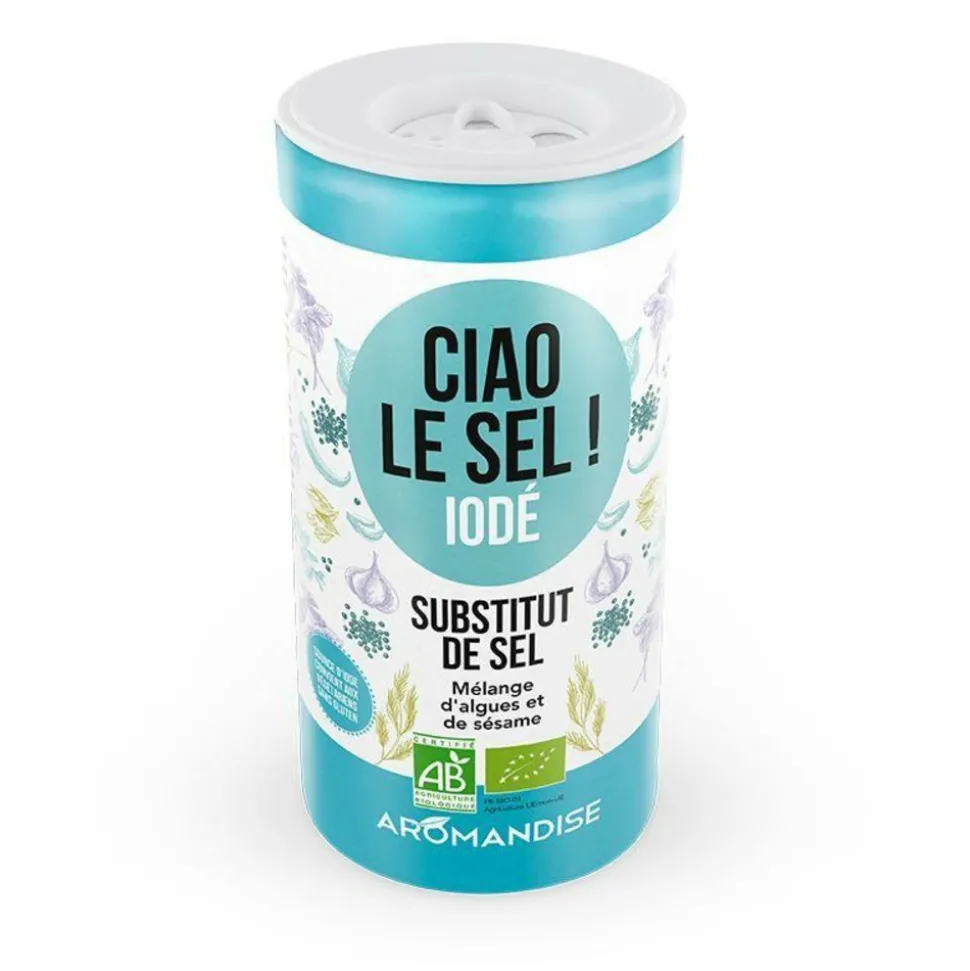 Aromates substitut de sel Ciao le Sel Iodé c’est un mélange de graines de sésame grillées, d’algues Wakamé et d’algues kombu de l’Atlantique, pour un condiment agréablement iodé qui permet de remplacer l’effet gustatif et hédonique que procure le sel ! Un savoureux substitut pour diminuer la consommation de sel de table ! Ciao le sel est à utiliser comme un condiment de table classique, son format pratique vous permet de l’utiliser à table, sur vos plats, ou dans vos préparations culinaires. Contenance : Boîte de 70 g net. Graines de sésame grillées 60%, algues Nori de l’Atlantique 30%, algues Kombu de l’Atlantique 10%. Ce produit est issu de l’agriculture biologique. Découvrez aussi notre gamme de substituts de sel.