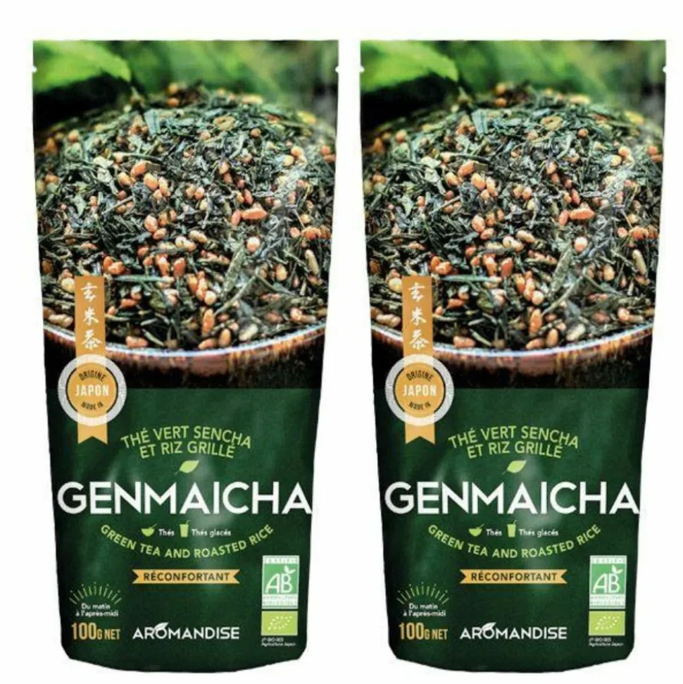 Le Genmaicha a un goût malté très agréable, fruit de l’union des propriétés du thé vert Sencha et de l’effet réconfortant et nourrissant d’une céréale sans gluten. Le thé japonais est exclusivement du thé vert. Contrairement aux autres thés verts, le thé vert japonais subit une torréfaction spéciale, avec de la vapeur d’eau. Les principaux thés japonais sont les Sencha, Bancha, Tamaryokucha et Gyokuro. Certains thés du Japon sont préparés avec un luxe de soins dont seuls les japonais sont capables. Le Genmaicha est un thé traditionnel japonais, mélange de thé vert Bancha et de riz brun grillé. Les notes végétales fraîches du thé s’associent harmonieusement à celles torréfiées des céréales, et lui confèrent un goût très caractéristique qui en fait un thé très apprécié de ceux qui ne sont pas habitués au thé vert. 2 sachets de 100 g.