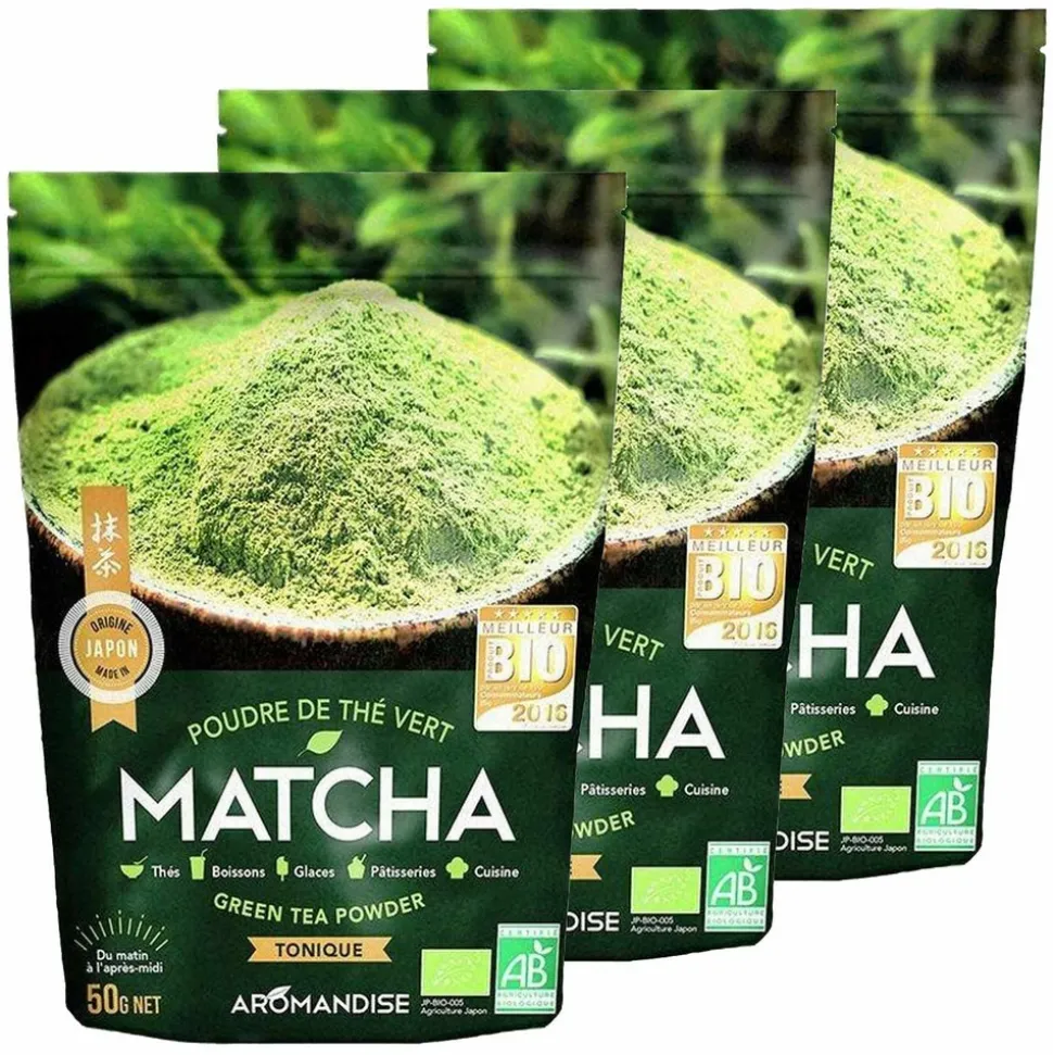3 sachets de 50 g de poudre de thé matcha. Adulé au Japon, le thé Matcha fait partie de la vie quotidienne. Fabriqué à partir des jeunes pousses de thé, les feuilles sont ensuite cuites à la vapeur, séchées et moulues jusqu’à obtenir une poudre bien lisse. L’avantage du thé Matcha est que vous pouvez facilement l’utiliser pour diverses préparations. En plus des boissons chaudes et froides, il est idéal pour colorer vos pâtisseries ou vos glaces et pour leur donner un goût légèrement fumé de thé. Au Japon, il stimule l’esprit en étant traditionnellement battu au fouet lors de la cérémonie du thé, appelée Chanoyu. Pour cela il faut recouvrir votre poudre de thé matcha d’une eau tiède, mais pas bouillante (70°C environ). Ensuite fouetter le thé avec un petit fouet jusqu’à ce que de la mousse apparaisse, pour le déguster ensuite. Au quotidien, une eau un peu plus chaude conviendra et vous pourrez déguster votre thé japonais Matcha Bio juste après avoir mélangé. Il est recommandé d’utiliser 1 gramme de thé en poudre pour 100 ml d’eau chaude.