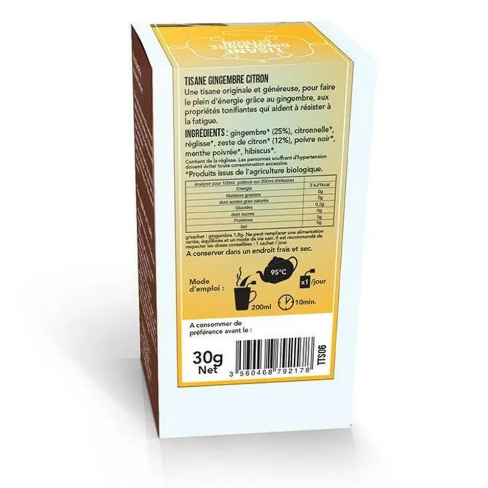 Tisane Bio Gingembre Citron 20 sachets La Tisane Gingembre Citron, à la saveur relevée et gourmande satisfera les palais en quête d’originalité ! Une tisane originale et généreuse, pour faire le plein d’énergie grâce au gingembre, aux propriétés tonifiantes qui aident à résister à la fatigue. Les Tisanes du Monde sont les incontournables des infusions. Une gamme conçue pour faire découvrir ou redécouvrir ces tisanes phares ! Composition : gingembre*(25%), citronnelle*, réglisse*, zeste de citron*(12%), poivre noir*, menthe poivrée*, hibiscus* *Produit issu de l’agriculture biologique.
