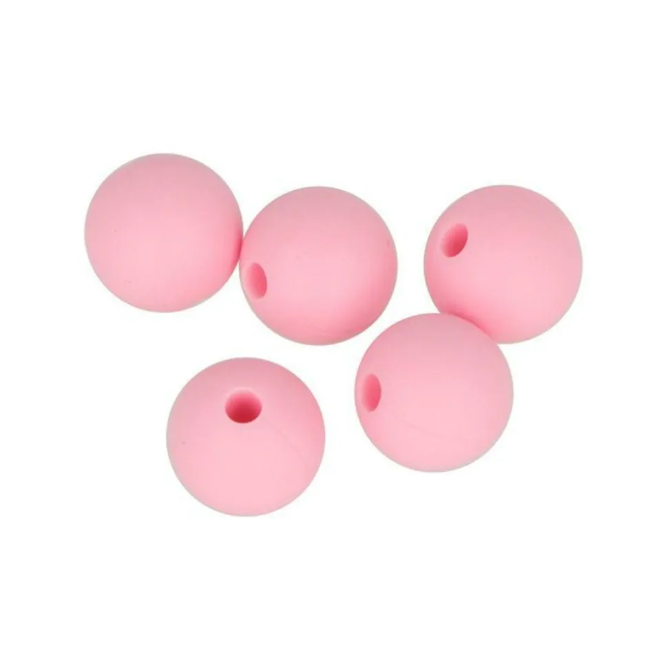 Sachet de 5 perles rondes en silicone de couleur rose – 10 mm. Avec ces perles de silicone, vous pouvez fabriquer des accessoires (pendentifs, colliers) à mâcher pour votre bébé. Les perles de silicone aident au développement des dents.