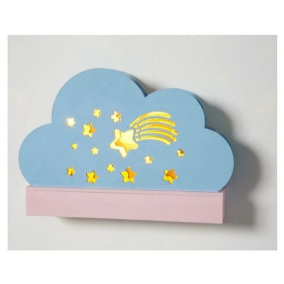 Lampe en bois naturel LED à décorer Nuage En bois brut non traité et non verni, cette boîte nuage composé de 2 plaques en forme de nuage, enserrant la boîte contenant le système lumineux. Les 2 plaques nuages sont percées d’étoiles et d’une étoile filante pour laisser passer la lumière et créer une ambiance de nuit étoilée. Celle-ci est générée par 8 LEDs fonctionnant avec 2 piles AA/LR6 1,5V (non fournies). La boîte lampe en forme de nuage mesure 25 x 13,7 x 5,5 cm. Vous pouvez décorer la boîte en bois par la peinture, des pochoirs, des papier décoratif à collers, des masking tapes ou des stickers.