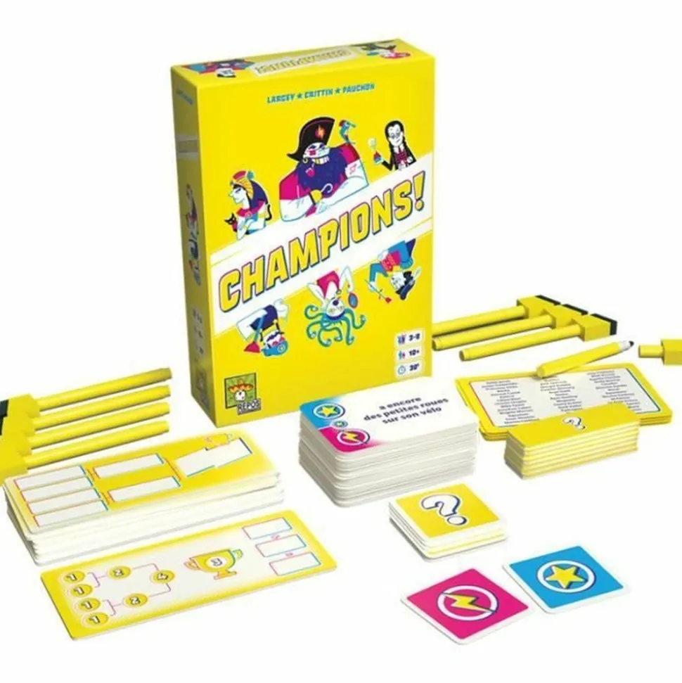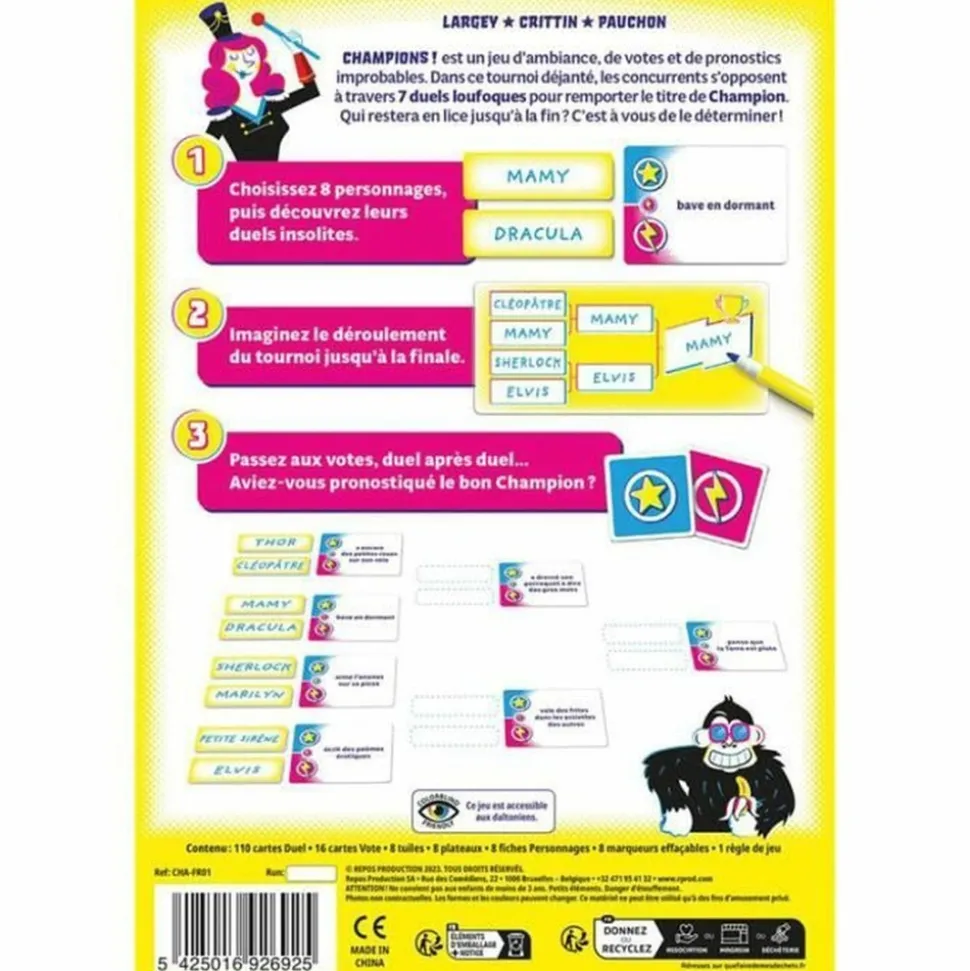 Qui de Frankenstein ou de votre Mamy compte sur ses doigts ? a chaque manche, 8 personnages ou célébrités (réels ou imaginaires) s’affrontent dans un tournoi de duels loufoques et improbables. Saurez-vous prédire des le début du tournoi celui remportera le titre de Champion ? Un jeu festif, fun et convivial.
