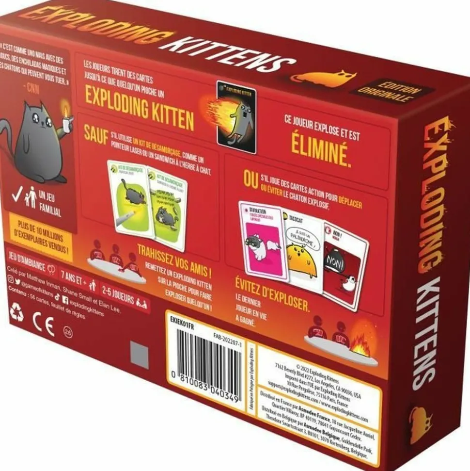 Jeu de cartes explosif où les chatons côtoient grenades, missiles nucléaires et torpilles. Gardez-vous des déflagrations, forcez les autres a jouer des cartes pour qu’ils explosent. Convient aux enfants à partir de 7 ans. Durée de jeu de 15 minutes. Marque ASMODEE. Genre mixte. Type de jeu de société : jeu de carte.