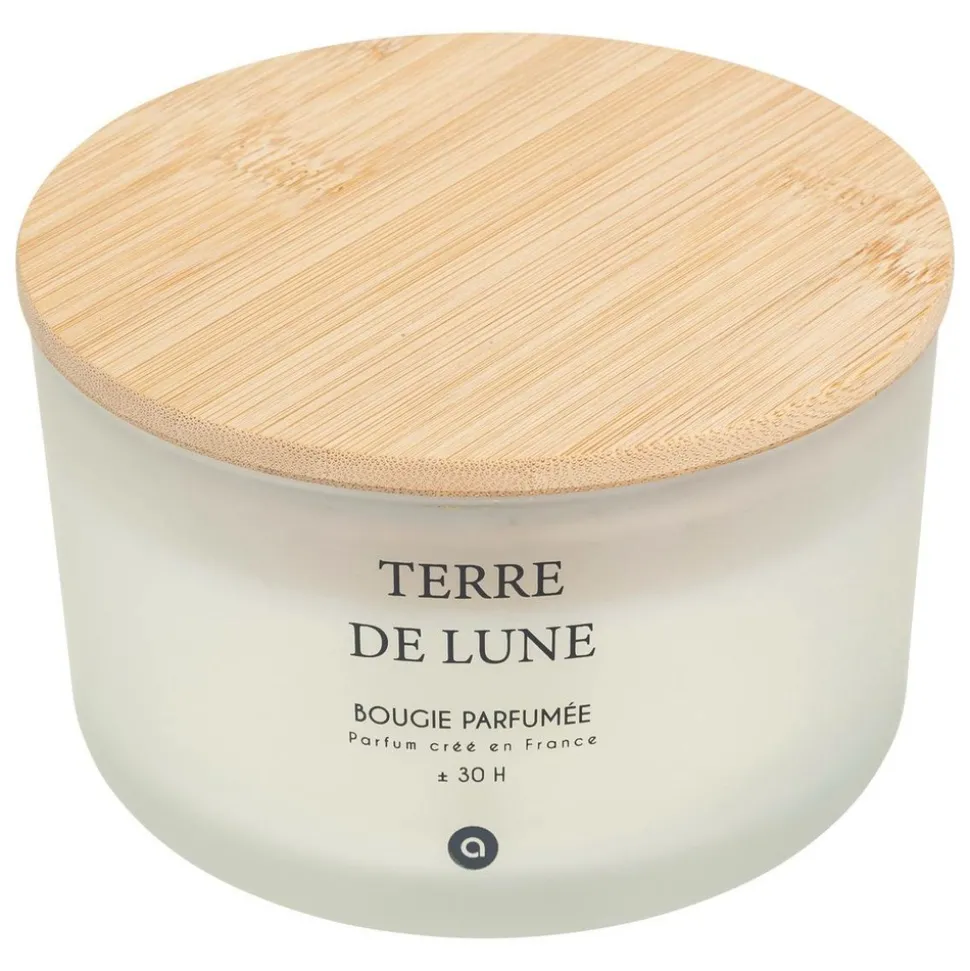 Placée dans un contenant en verre cylindrique, la bougie parfumée* « Terre de Lune » Atmosphera est équipée d’un couvercle en bambou qui permet de l’éteindre facilement. Grâce à trois mèches en bois et 420 g de paraffine, cette bougie vous procurera environ 30 heures d’une senteur délicate aux pétales de musc. Recyclez le contenant en photophore en y installant une bougie chauffe-plat !