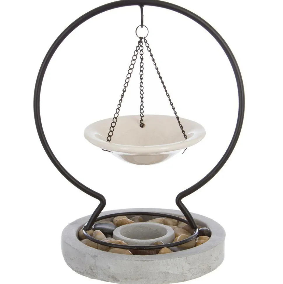 Ce brûle-parfum avec pierres décoratives est composé d’un support cylindrique en ciment brut, contenant des galets et un emplacement pour bougie. Une structure métallique en arc est équipée d’un crochet auquel une coupelle en céramique est suspendue afin d’accueillir de l’huile parfumée. Avec ses dimensions de 20 x 24 cm, il sera du plus bel effet sur un buffet ou sur une table.