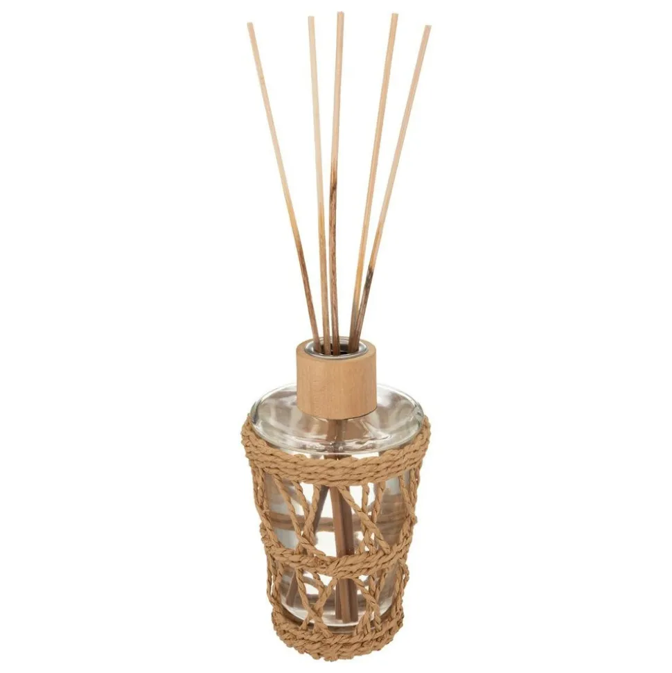 Le diffuseur de parfum « Seav » se distingue par son contenant en verre décoré de papier tressé. Doté d’un couvercle en bois de pin et de bâtonnets en rotin, son huile au parfum exotique vous permettra de créer une ambiance olfactive dans votre univers. Évadez-vous dans votre salon !
