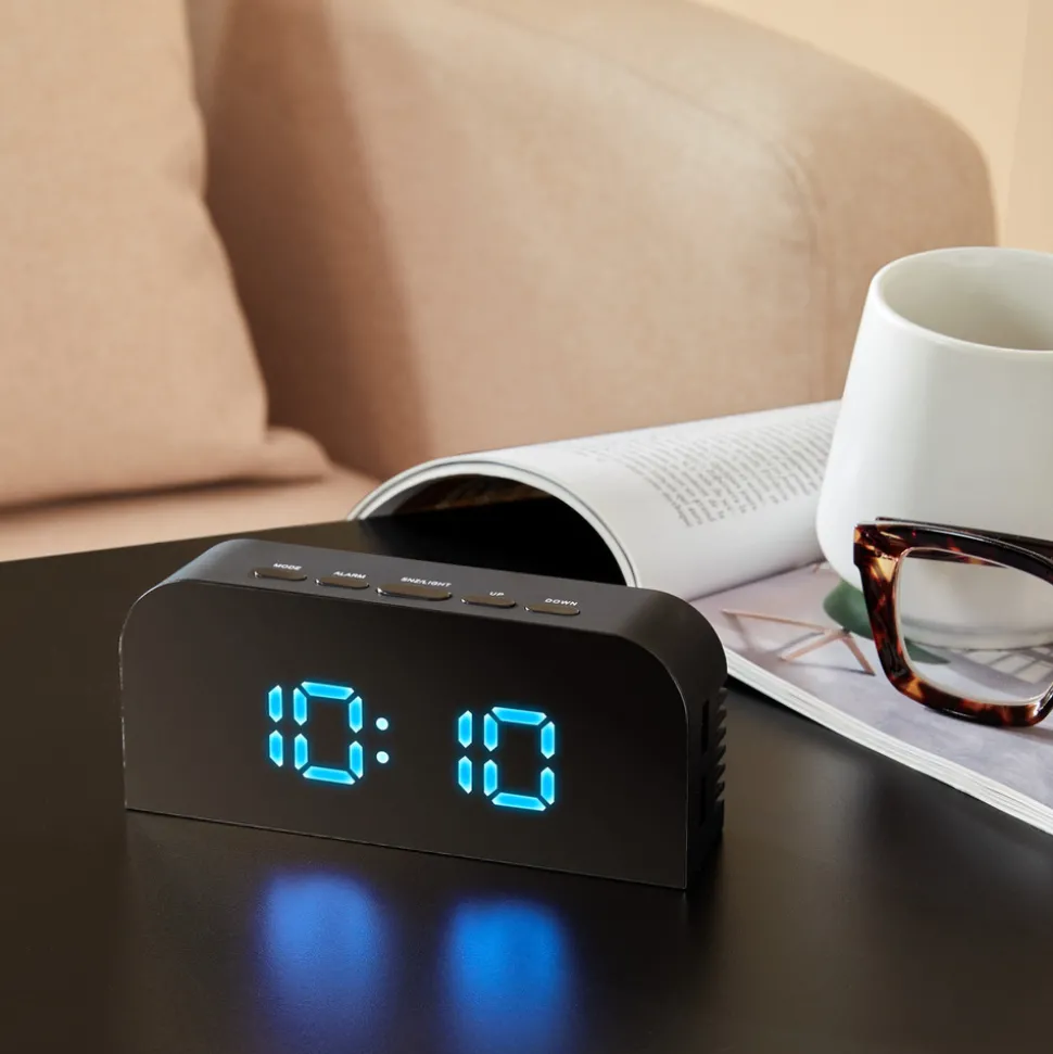 Pratique et compact, le réveil digital « Nelson » Atmosphera joue la carte d’un design moderne et épuré. Ce réveil dispose de plusieurs fonctions et se recharge grâce au câble USB fourni. Avec ses lignes arrondies et sa façade en verre, il trouvera sa place sur une table de chevet pour accompagner vos réveils en douceur.