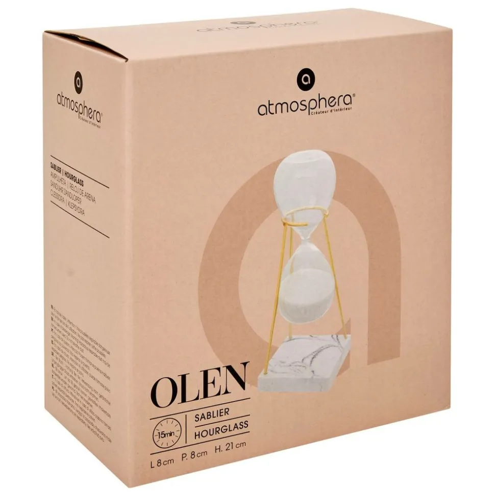 Raffiné et élégant, le sablier « Olen » Atmosphera est un objet déco à la fois utile et esthétique. Ce sablier en verre est garni de sable et placé dans un support en acier doré. Il suffit de l’en extraire pour le retourner, la minuterie correspondant à 15 min. La base en résine grise au fini marbré déposera une touche sophistiquée sur une table basse en verre ou en bois foncé. Associez-le à un mot à poser de la même ligne pour créer un ensemble harmonieux !