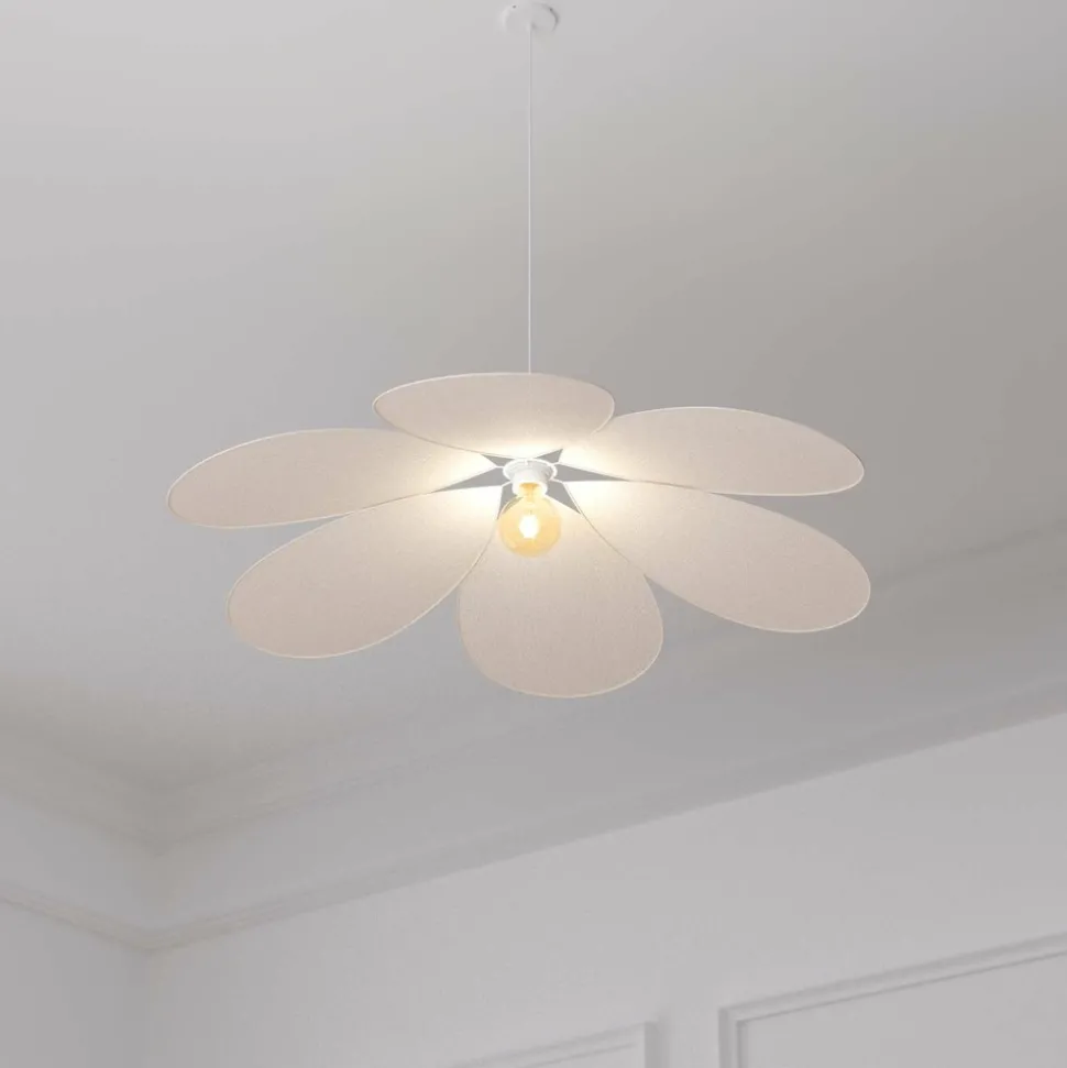 Très originale, cette suspension illuminera joliment n’importe quelle pièce de votre maison. Son abat-jour en lin reprend la forme délicate d’une fleur. De plus, son large diamètre fait de ce luminaire un objet de décoration à part entière.