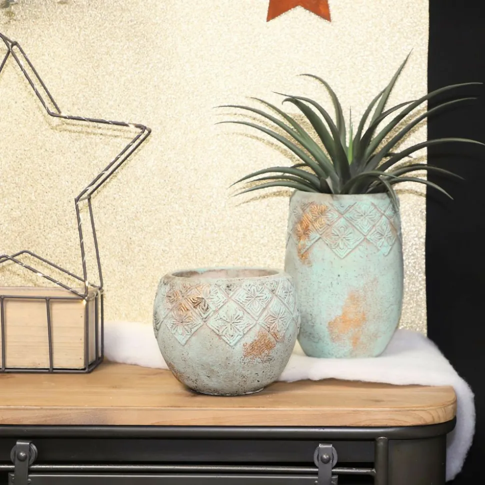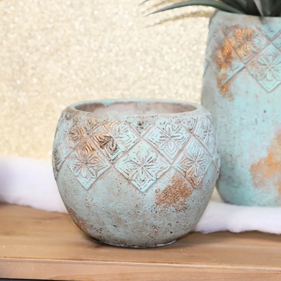 Couleur détaillée : Le cache-pot présente des nuances de vert de gris avec des tâches de cuivre, créant une apparence subtile et élégante. Les motifs de fleurs royales en relief ajoutent une touche de sophistication et de tradition à son design.