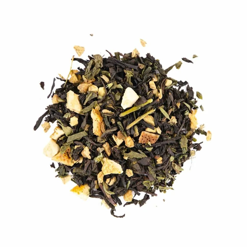 Thé noir, thé vert, morceaux de gingembre, écorces de citron, huile essentielle de citron de Syracuse 4,8%, basilic, thym, arômes