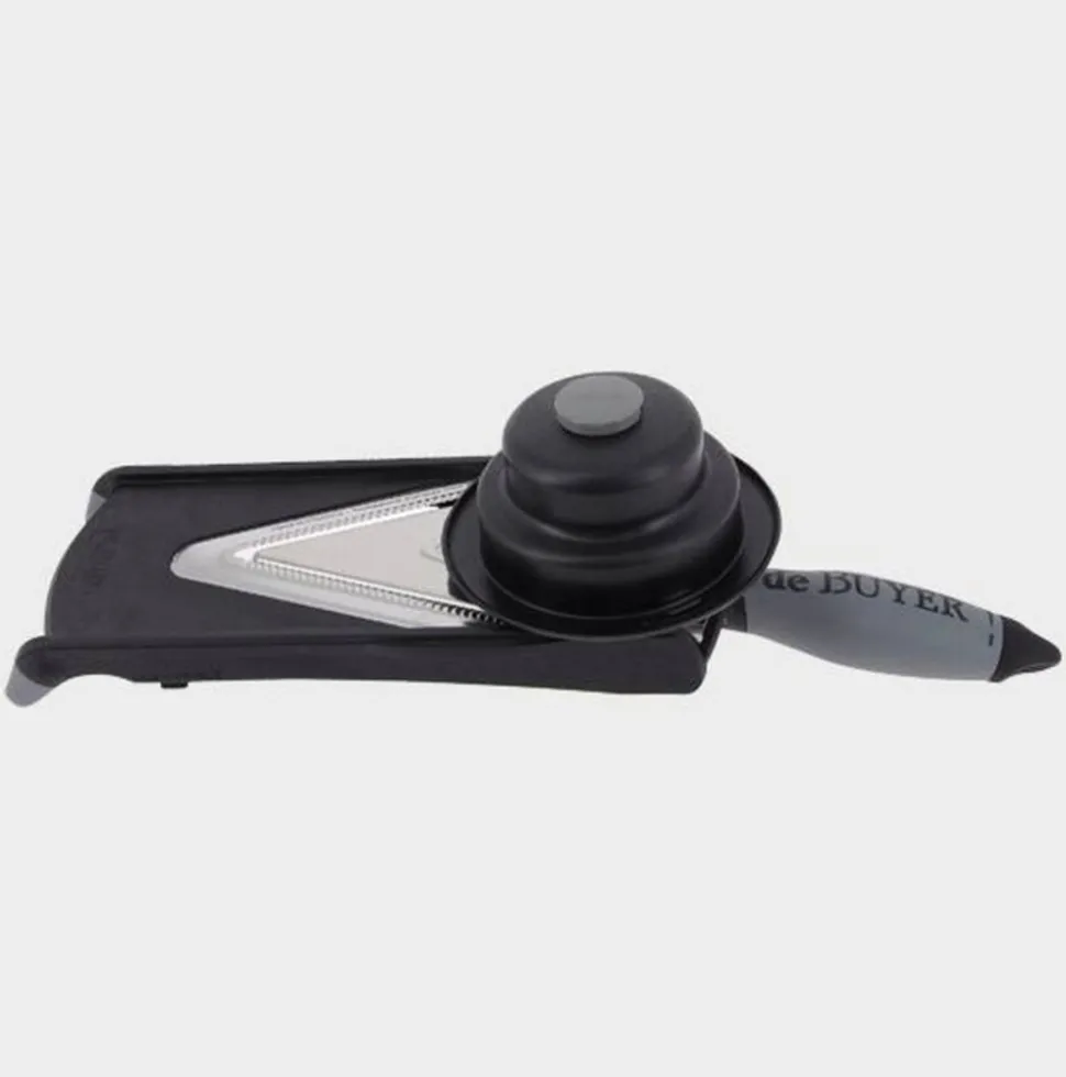 Mandoline/Coupe-tranche Kobra V Axis De Buyer 2011.01 coupe tous vos fruits et légumes en tranches facilement et rapidement.PROFESSIONNELLEEn acier inoxydable et polypropylène. Lame de qualité professionnelle fabriquée à Thiers.Innovation système ClicExpressnouveau système de réglage de la hauteur de coupe, rapide, sûr, et efficace, permettant de réaliser des tranches ultrafines de 0.2 mm à 5 mm. (avec un pas de 0.2mm)EFFICACELa lame pénètre facilement dans le produit. Les micro-dentelures de la lame permettent de couper plus facilement tous les fruits/légumes en tranches très fines, tout en préservant la constitution de leur chair. Angle de coupe à 19,3° optimisé. Coupe facilement et parfaitement tous les fruits et légumes mêmes les plus mous (tomates, poires, etc.).PRATIQUE & FACILELa rampe en inox permet aux aliments de bien glisser pour un mouvement facile.La molette intégrée au bout du manche permet de régler l?épaisseur jusqu?à 5 mm. Poignée ergonomique pour une prise en main naturelle.SUREPoussoir protecteur : pas de contact avec la lame lors de l?utilisation.Poignée anti-glisse.Stabilité lors de la coupe grâce aux pieds anti-dérapants.Entretien : lavage à la main.