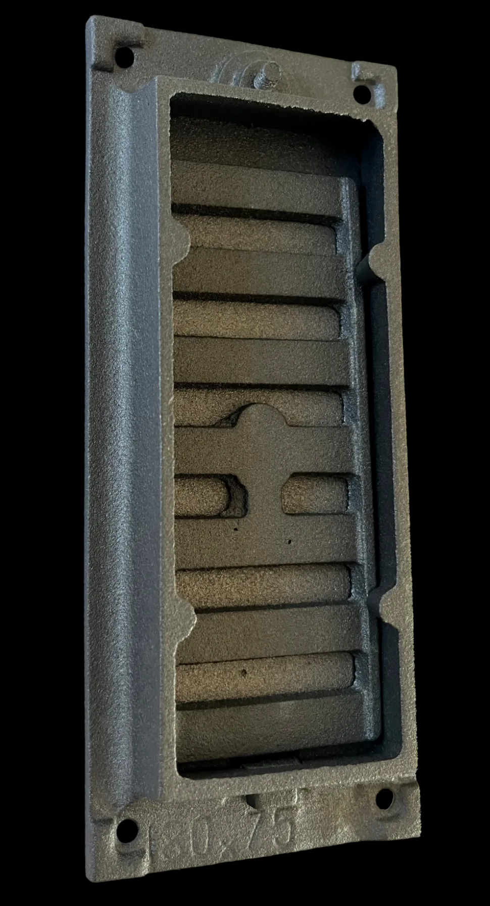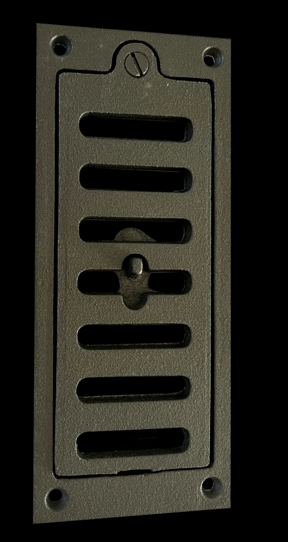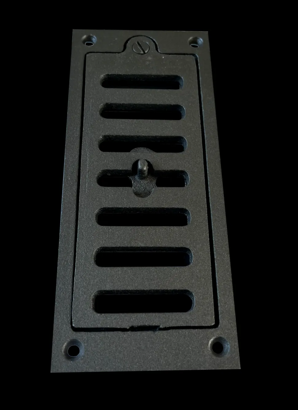 Grille à coulisse en fonte, gris fonte, 180 mm x 75 mm. Epaisseur totale 20 mm, épaisseur d’encastrement 15 mm. Cette grille à coulisse permet de moduler à volonté la circulation de l’air.