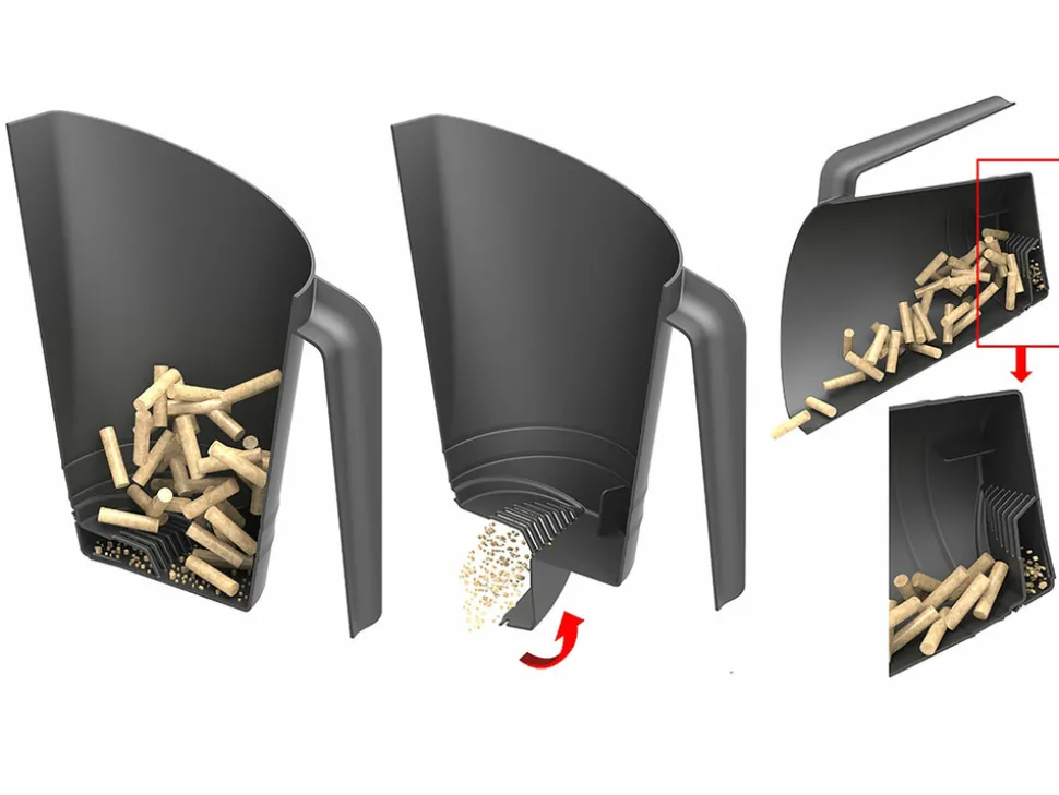 Son système breveté permet de garder au fond de la pelle la poussière des granulés pour un vidage propre et facile.