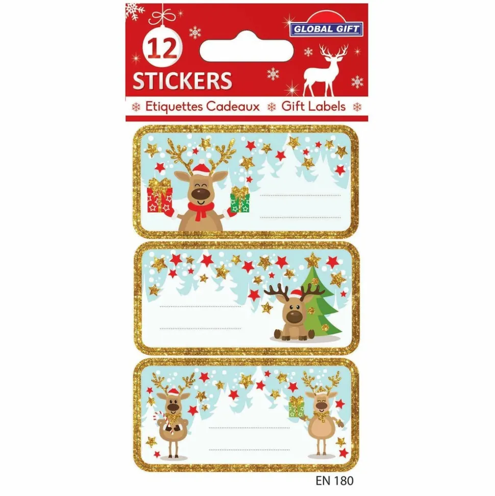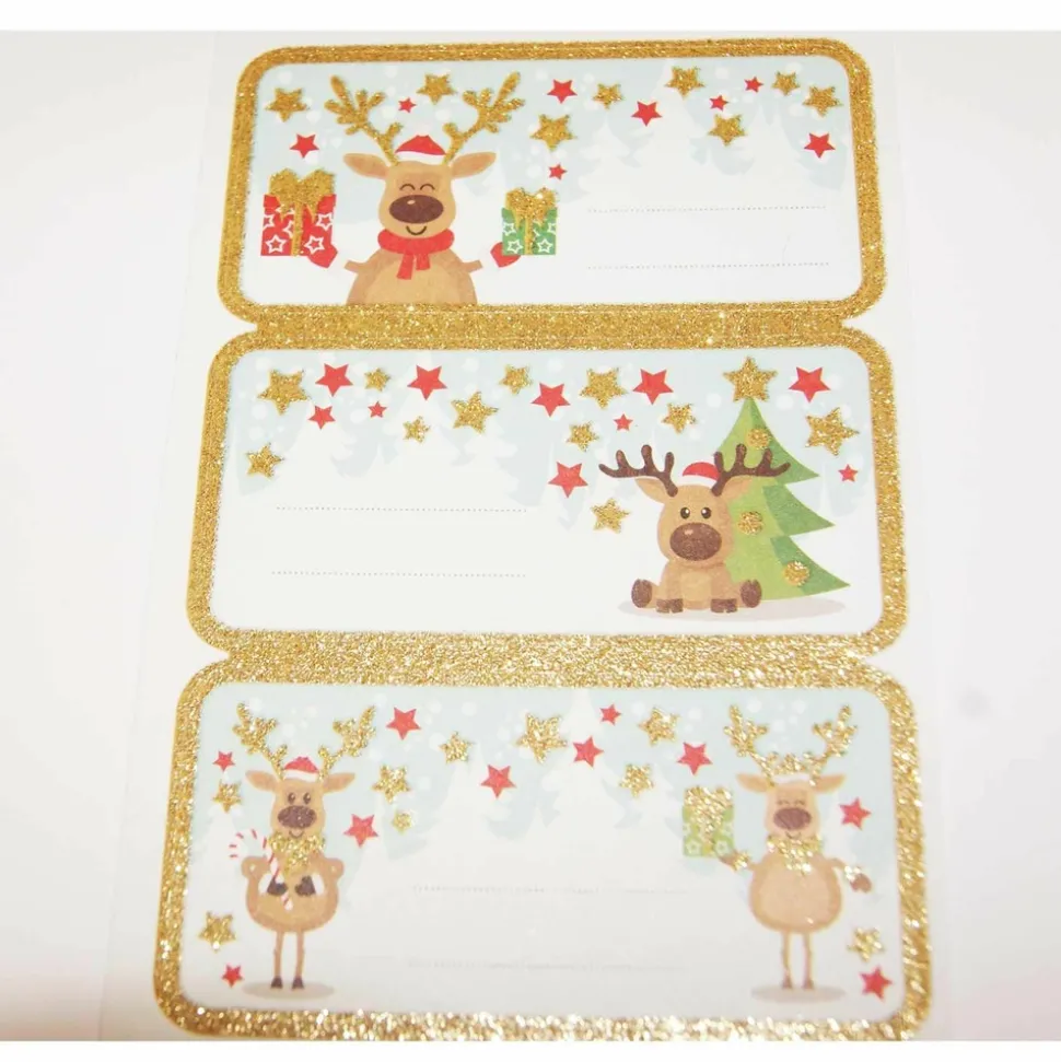 12 étiquettes adhésives sur le thème de Noël pour personnaliser vos cartes de voeux et vos cadeaux de Noël. Très pratiques à utiliser, vous pourrez embellir en un instant vos emballages de Noël et vos projets scrapbooking. Dimensions de la feuille d’autocollants : 7,5 x 12 cm. Motifs : Rennes. Stickers avec des paillettes dorées.