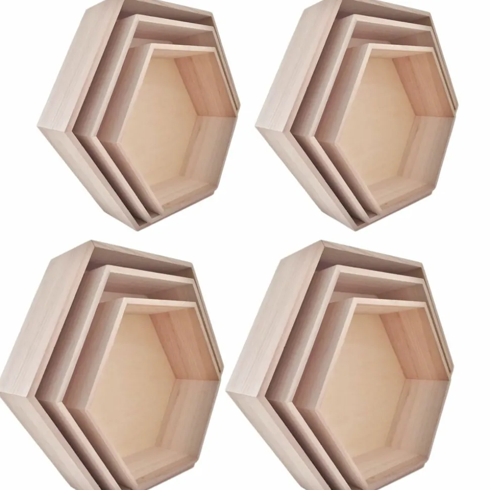 Ces 4 ensembles de 3 étagères hexagonales en bois créent une ambiance scandinave dans vos intérieurs. Vous pouvez les personnaliser en fonction des couleurs de votre intérieur ou les laisser brut pour un rendu plus naturel. Vous pouvez également les décorer avec du papier décoratif à coller, du vernis, de la mosaïque et d’autres embellissements de votre choix. Grâce à leur aspect graphique, fixées au mur ou posées sur un meuble, ces étagères hexagonales seront du plus bel effet. Chaque pack comprend trois étagères de tailles différentes. Les étagères mesurent De 30 à 40 cm. Dimensions : 30 cm / 35 cm / 40 cm. Profondeur : 10 cm. 2 attaches métalliques au dos, sur chaque étagère, pour pouvoir les accrocher au mur facilement. Vis non comprises.