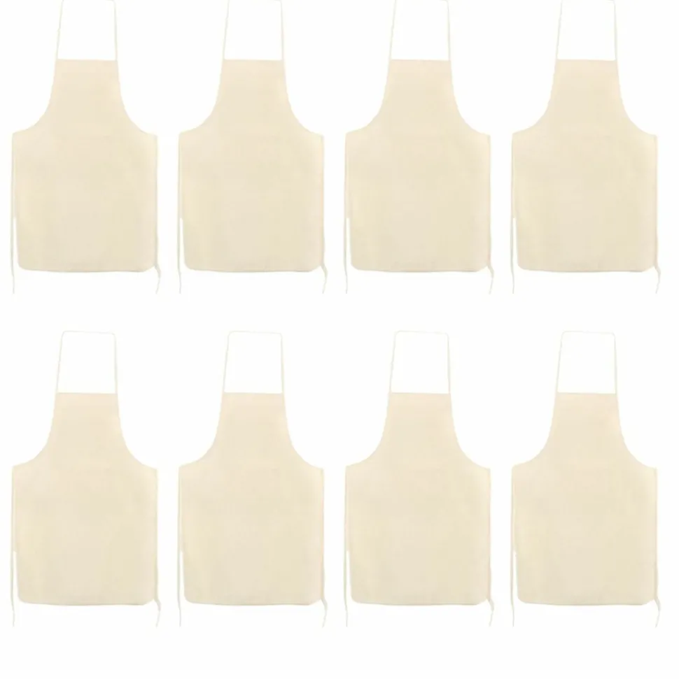 8 tabliers pour adultes en coton. Ce tablier de cuisine ou de bricolage est blanc cassé. De taille adulte (90 x 60 cm), il est composé d’une ficelle tour-de-cou, une ficelle d’attache autour de la taille et d’une petite poche ventrale. Indispensable pour tous les travaux salissants, de la peinture à la céramique, des feutres à la cuisine créative !