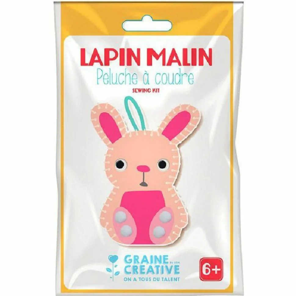 Peluche à coudre lapin, à partir de 6 ans. Mode d’emploi : enfiler le fil dans l’aiguille en plastique. Passer l’aiguille dans les trous pour relier les pièces avant et arrière. Remplir la peluche avec la ouate avant la dernière piqûre. Faire un double noeud pour sécuriser le point final. Le kit contient le patron en tissu, 2 rubans une ficelle, des morceaux de tissu de couleur, un sachet de ouate de rembourrage, une aiguille en plastique et quelques strass. 12 x 19,5 x 1 cm