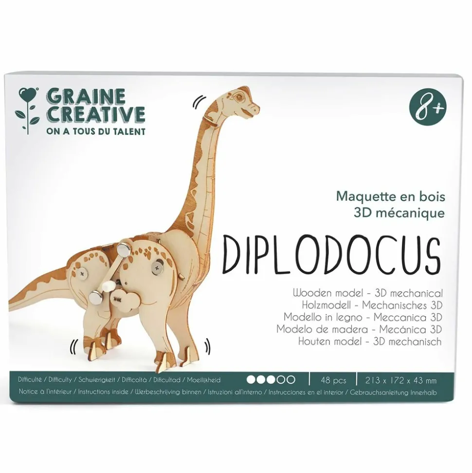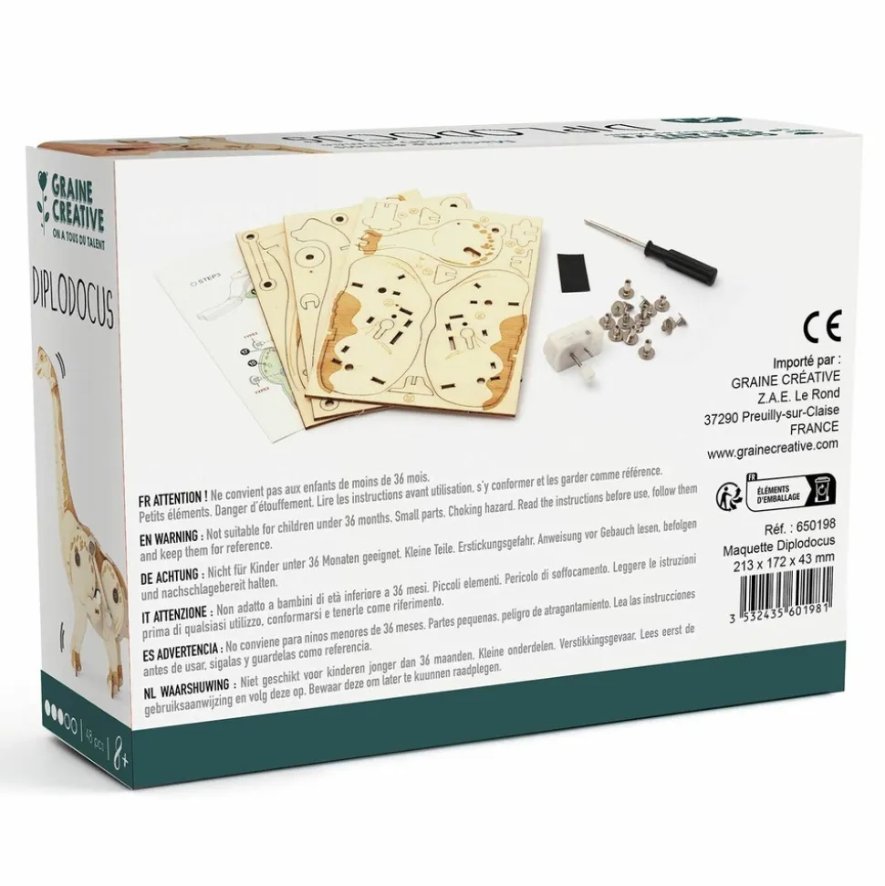 Maquette en bois 3D mécanique à assembler sans colle représentant un diplodocus mesurant environ 21,3 cm x 17,2 cm. Contenu : planches de formes détachables, visserie, petit papier ponce, 1 tournevis, 1 mécanisme à remonter, 1 mode d’emploi. Utilisation : Détachez les pièces pré-découpées des planches puis assemblez-les en suivant le mode d’emploi ! Découvrez aussi toutes nos autres maquettes pour commencer une vraie collection ! Adapté aux enfants de 8 ans et plus.