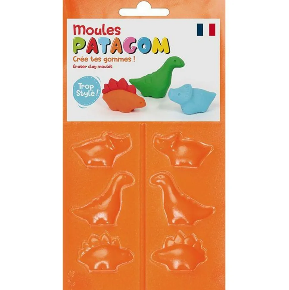 Moule pour pâte à gomme dinosaures Patagom est une pâte fantastique pour créer ses propres gommes. Prends un morceau de Patagom dans tes mains, la texture est douce et malléable. Il suffit de la modeler, les couleurs sont miscibles entre elles, c’est-à-dire que tu peux obtenir de nouvelles nuances de couleurs en les mélangeant. Réalise ta création, puis mets la pâte à gomme au four pendant 15 min à 120°C. Sors-la du four et attends qu’elle refroidisse. La gomme fonctionne aussi bien qu’une gomme standard, mais c’est toi qui choisis le design selon tes préférences : cornet de frites, dinosaure, héros de dessin animé, pastèque ourson, tout est possible !! Activité enfants à partir de 8 ans. Dimensions : 3 cm par forme. Prix de l’innovation, catégorie ‘Produit de l’année’ du salon Creativeworld 2019.