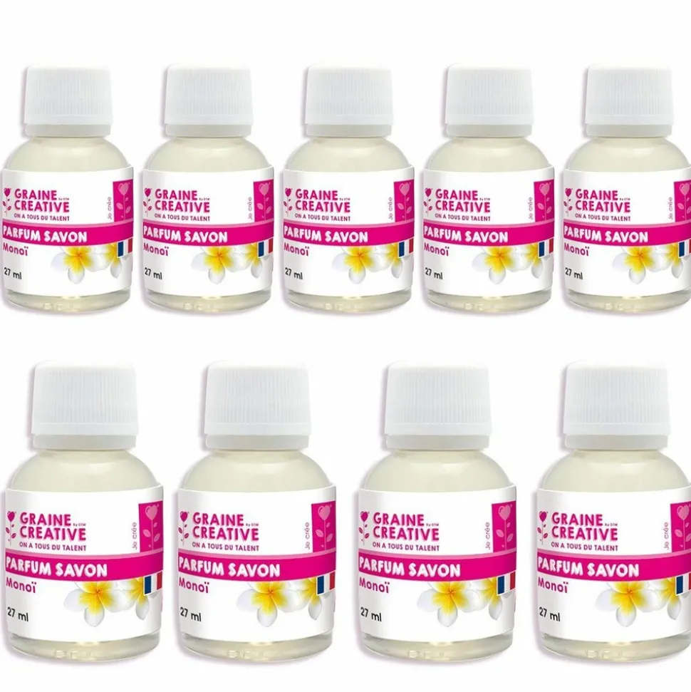 Parfum à bougie monoï 9 pots de 27 ml. Donnez un arôme délicat et subtil à vos bougies, avec ce parfum à bougie au monoï. Faites vos bougies vous-même avec un moule, de la cire à bougie, un colorant et tous les accessoires disponibles sur la boutique. Mode d’emploi : Verser le parfum monoï au dernier moment avant de couler votre mélange dans le moule pour éviter que le parfum ne s’évapore. Mélanger 2% de parfum monoï dans votre bougie fondue, ou plus selon votre souhait. Ne jamais surchauffer. Fabriqué en France.