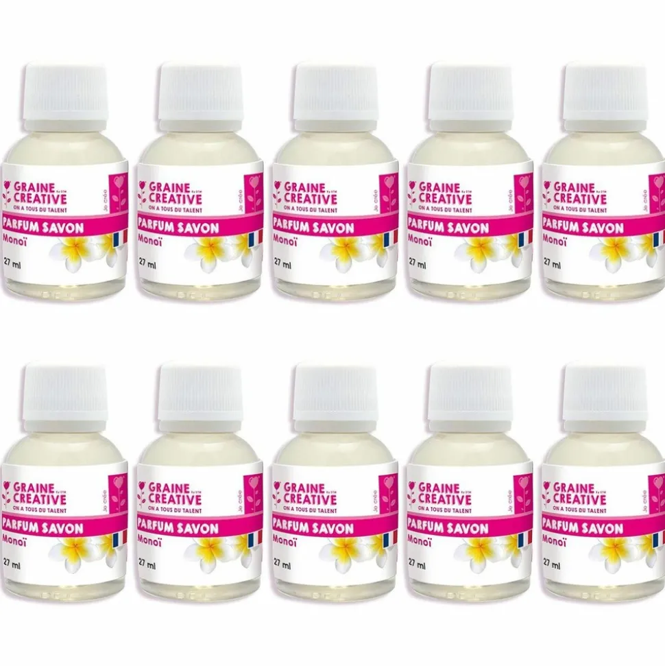 Parfum à bougie monoï 10 pots de 27 ml. Donnez un arôme délicat et subtil à vos bougies, avec ce parfum à bougie au monoï. Faites vos bougies vous-même avec un moule, de la cire à bougie, un colorant et tous les accessoires disponibles sur la boutique. Mode d’emploi : Verser le parfum monoï au dernier moment avant de couler votre mélange dans le moule pour éviter que le parfum ne s’évapore. Mélanger 2% de parfum monoï dans votre bougie fondue, ou plus selon votre souhait. Ne jamais surchauffer. Fabriqué en France.