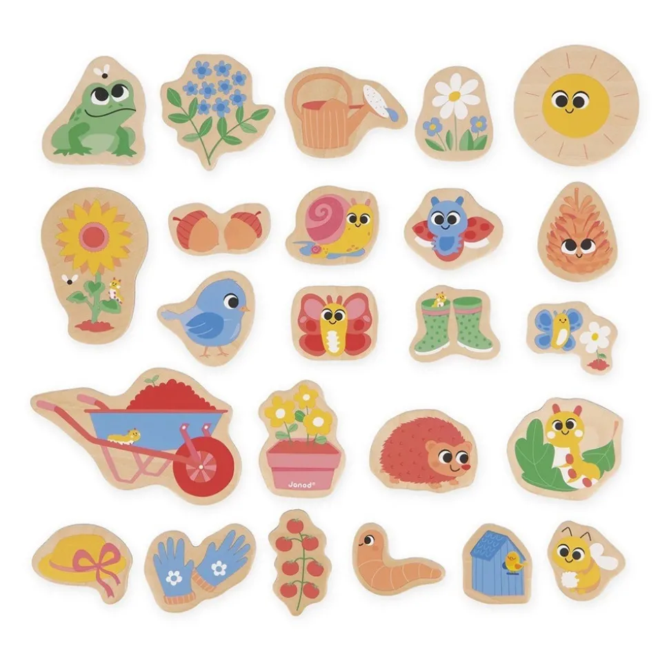 Set de 24 magnets en bois joliment illustrés sur le thème du jardin.