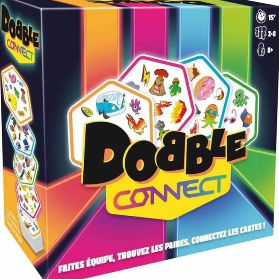 Jouez en équipe a Dobble Connect Zygomatic et soyez les premiers a aligner 4 cartes avec le meme symbole. De nouvelles regles amusantes pour s’amuser en famille ou entre amis ! Ce jeu de société convient aux joueurs à partir de 8 ans et peut etre utilisé en intérieur. Durée du jeu : 30 min.