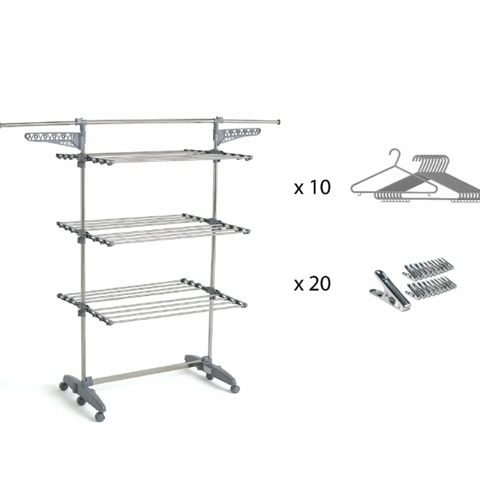 Étendoir à linge multifonction grande capacité avec 30 accessoires (20 pinces à linge inox+10 cintres incassables), entièrement modulable, pratique grâce à ses portes cintres intégrés ! étendez jusqu’à 25 m de linge (équivalent 3 machines) sur 3 niveaux ! Idéal pour les familles nombreuses.Equipé de 2 portes-cintres, d’une barre d’extension pour étendre les draps et autres linges volumineux, de 6 roulettes rétractables et orientables pour un déplacement aisé et une meilleure stabilité. Pieds extra-larges avec système anti-balancementTrès compact une fois replié, se range facilement. Installation en quelques secondes seulement. Capacité Record de 25m d’étendage. Large espace entre les barres pour une meilleure circulation de l’air et un séchage plus rapide. Installation facile et rapide. Faible encombrement. Matière: barres en acier et montants en plastique.Ses nombreuses options de configuration ainsi que ses accessoires malins: porte cintre, barre d’extension, barres rétractables, roues orientables, en font l’un des séchoirs les plus polyvalent actuellement sur le marché. Pinces à linge inox résistantes, ne rouillent pas. Pas de risque de dégradation de votre linge. Design moderne, pinces discrètes pour l’intérieur comme l’extérieur.