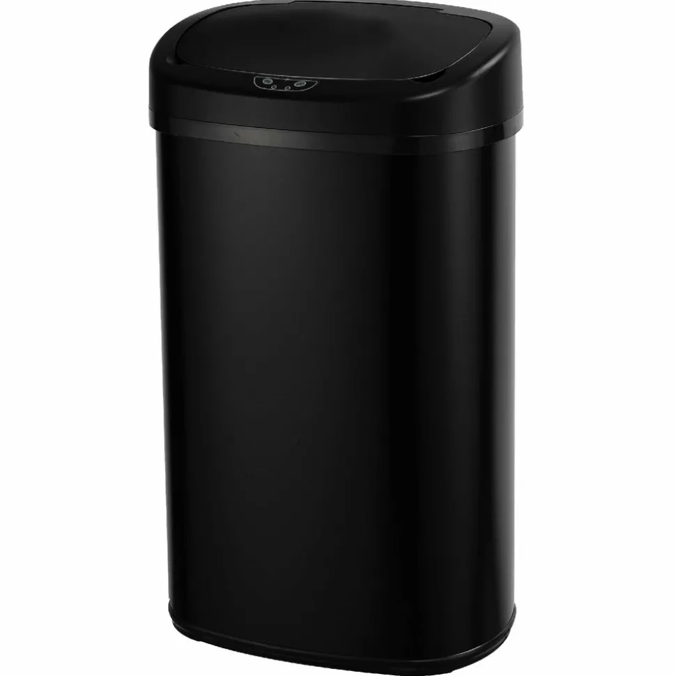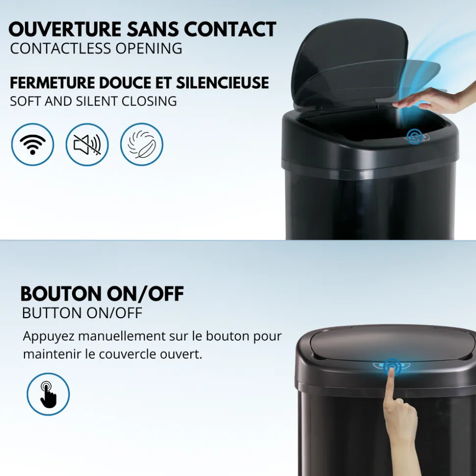 Poubelle de cuisine automatique rectangulaire avec cerclage Capacité 68L modèle MAJESTIC en acier Inoxydable Finition Black Mat Dimension: 41x29xH76cm Poids: 4kg. Grande capacitéCorps en INOX (0.4mm) et couvercle en ABS. Fonctionne avec 4 piles LR20 (non fournies). Bouton ON/OFF (pour maintenir le couvercle ouvert). Inclus: Un cerclage plastique pour maintenir votre sac poubelle, et un anneau au sol pour la protection des sols fragiles.Poubelle intelligente qui fonctionne avec un système infra-rouge et vous évite tout contact avec le couvercle de la poubelle. Pratique et hygiénique, le couvercle s’ouvre et se referme automatiquement lorsque vous passez votre main ou un objet à 15 cm au-dessus de la cellule photo électrique.Possibilité de maintenir le couvercle ouvert grâce aux boutons OPEN / CLOSE (pour une ouverture prolongée). Ses matériaux lisses (fer non-corrosif INOX fin et ABS) facilitent son entretien. Assemblage non requis.Plus qu’une poubelle, un meuble design. Il n’est pas utile de se baisser pour jeter ses déchets. Poubelle Stable. Base antidérapante.