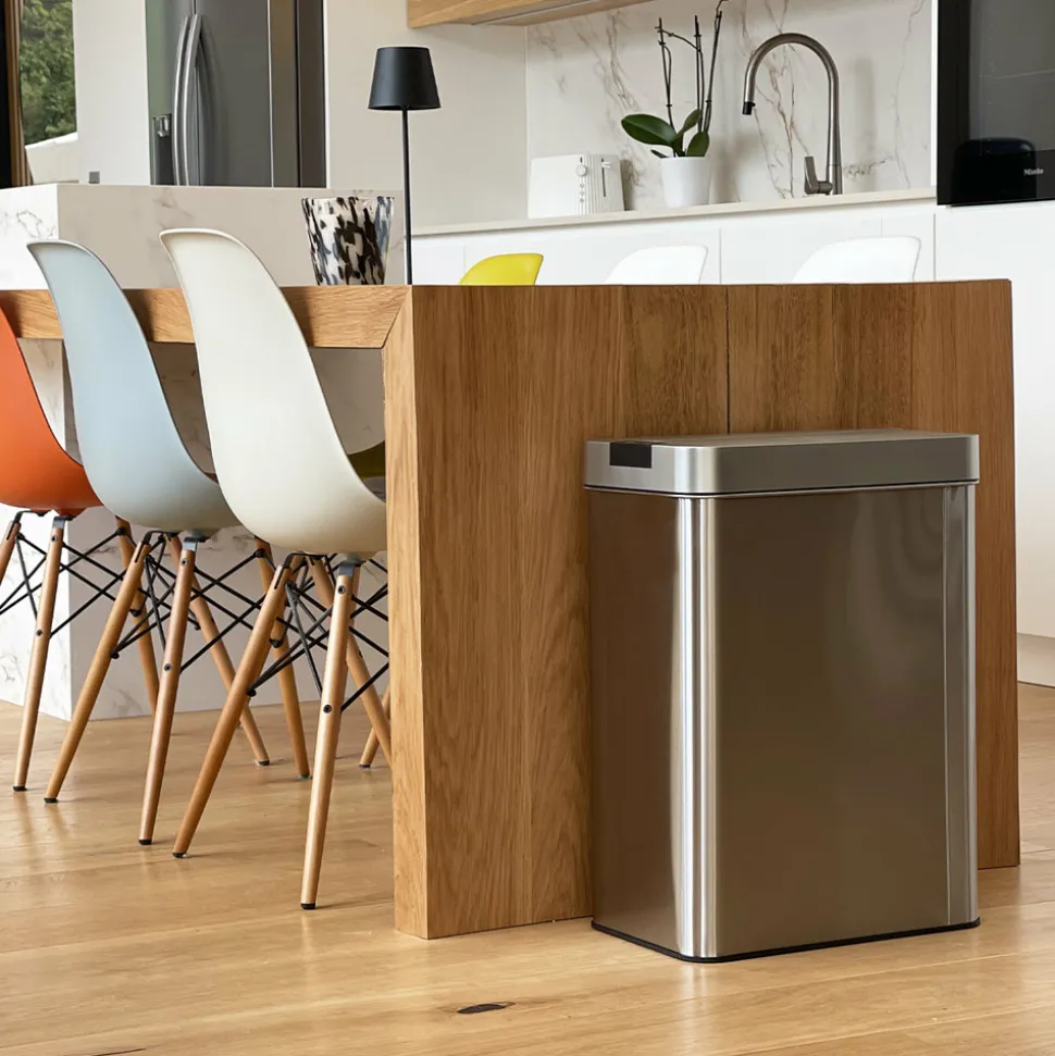 Poubelle de cuisine automatique rectangulaire avec cerclage Capacité 60L modèle SILVERLAKE en acier Inoxydable Finition Inox brossé Dimension: 41x26xH57cm Poids:4kg. Poubelle PapillonNouveau modèle. Cette poubelle de la gamme SILVERLAKE a tout pour plaire. Nul besoin de la cacher dans un coin : faites-en donc un élément à part entière de votre déco. Idéal pour la cuisine, la salle de bains, le bureau mais aussi tout autre endroit de passage où vous avez besoin d’une poubelle. Nouveau Design. Poubelle avec couvercle à ouverture automatique mains libres et look moderne et élégantCorps en INOX (0.4mm) et couvercle en ABS. Fonctionne avec 4 piles LR14 (non fournies). Possibilité de brancher le produit sur une prise secteur (en achetant l’adaptateur en option)Inclus: Un cerclage plastique pour maintenir votre sac poubelle, et un anneau au sol pour la protection des sols fragiles.Poubelle intelligente qui fonctionne avec un système infra-rouge et vous évite tout contact avec le couvercle de la poubelle. Pratique et hygiénique, le couvercle s’ouvre et se referme automatiquement lorsque vous passez votre main ou un objet à 15 cm au-dessus de la cellule photo électrique. Modèle solide, léger et résistant aux taches mais aussi aux traces de doigts. Réduit la prolifération bactérienne et prévient la diffusion des odeurs.Ses matériaux lisses (fer non-corrosif INOX fin et ABS) facilitent son entretien.Plus qu’une poubelle, un meuble design. Il n’est ainsi pas utile de se baisser pour jeter ses déchets. Poubelle Stable. Base antidérapante. Fermeture silencieuse et Anti-Traces de Doigts. Fermeture anti-odeurs.