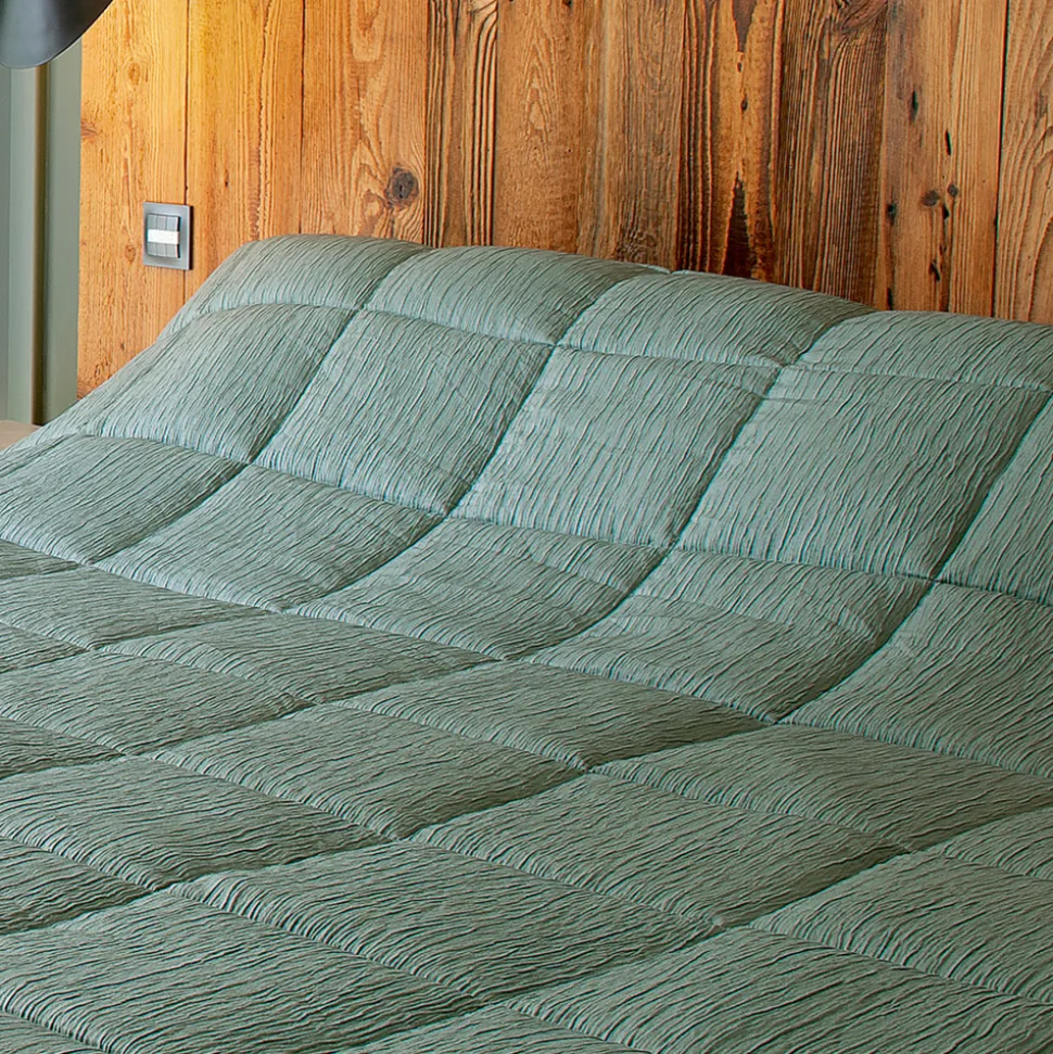 Avec ses différentes dimensions – 150 x 150 cm, 230 x 250 cm ou 250 x 260 cm – il s’adapte à tous les types de lits, qu’il soit utilisé en boutis léger ou en couvre-lit plus généreux. Son aspect légèrement froissé ajoute une touche décontractée mais élégante, parfaite pour créer une ambiance cosy et apaisante.