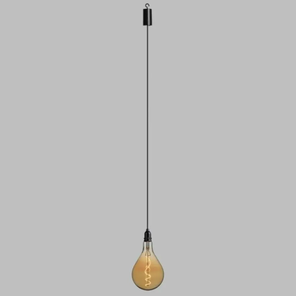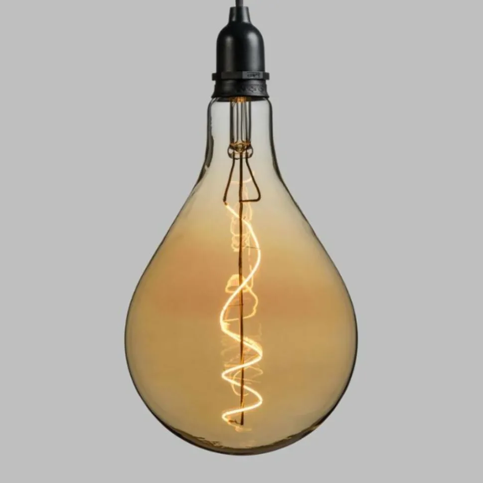 Ampoule Party Light en Verre finition Ambrée E27 Poire PS160 Ø160xH350mm Flex Spiral Filament LED BLANC CHAUD 2200°K, Télécommande IR max 4m 10 Fonctions, On-Off, Lumière Flamme, Fixe avec Luminosité Réglable, Timer 4-6-8 heures (désactivable), à pile 4xAA 1,5V, Porte Piles Cylindrique Crochet et Touche On-Timer-Off, IP44 Extérieur et Intérieur, Câble en caoutchouc Renforçé Noir 1m, Ampoule 3V 0,8W Remplaçable (Dévissage sens anti-horaire), Dim.Ø16xH135cm, Boîte color (PS160 3V FXL-IR 4AA).