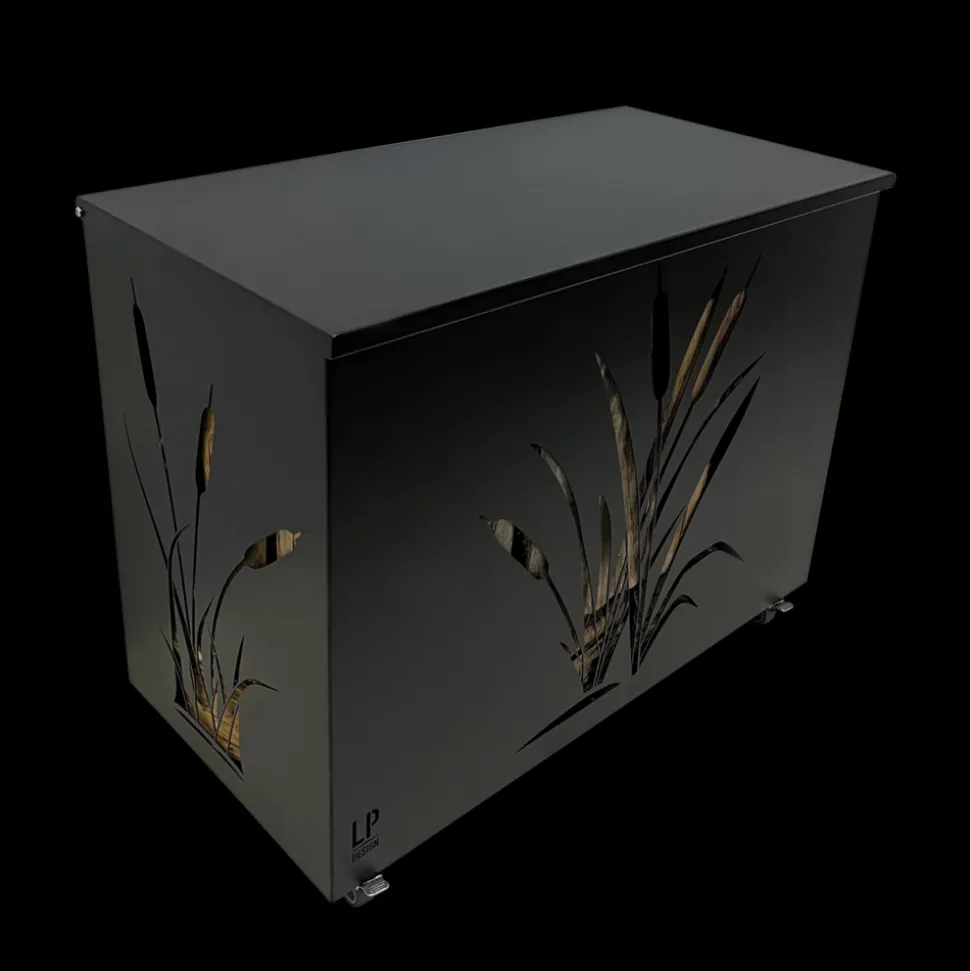 Collection MAISON, le coffre à bûches en acier peint sur roulettes décliné en 2 dimensions est très pratique pour stocker le bois proprement à la maison. Esthétique et très utile, il s’intègre facilement dans tous les styles de décoration. Équipé de roulettes avec freins, le transport des bûches est un jeu d’enfant ! Fini les maux de dos il suffit de le pousser sans effort démesuré. L’été, servez-vous de votre coffre pour stocker coussins et autres objets du jardin… vous lui trouverez sans aucun doute une fonction dans la maison ou sur la terrasse ! Infos produit – Dimensions : 80X40Ccm H 64m / Volume 0,2m3 / 23kg. Coloris : noir 9005 fine texture – Motif découpe laser – 100% acier peint – Garantie 2 ans. Existe en 50X40cm H 64cm. FABRICATION FRANÇAISE