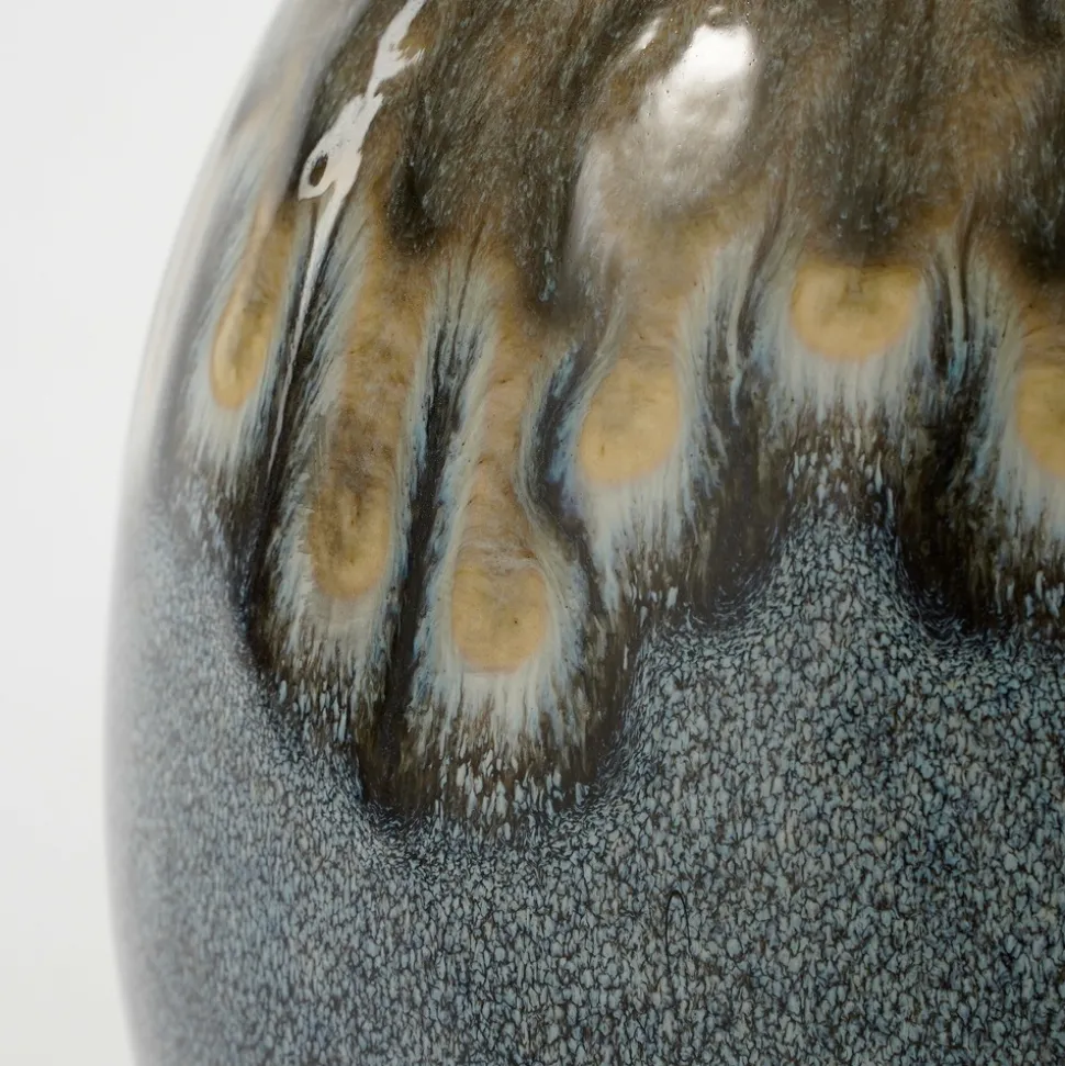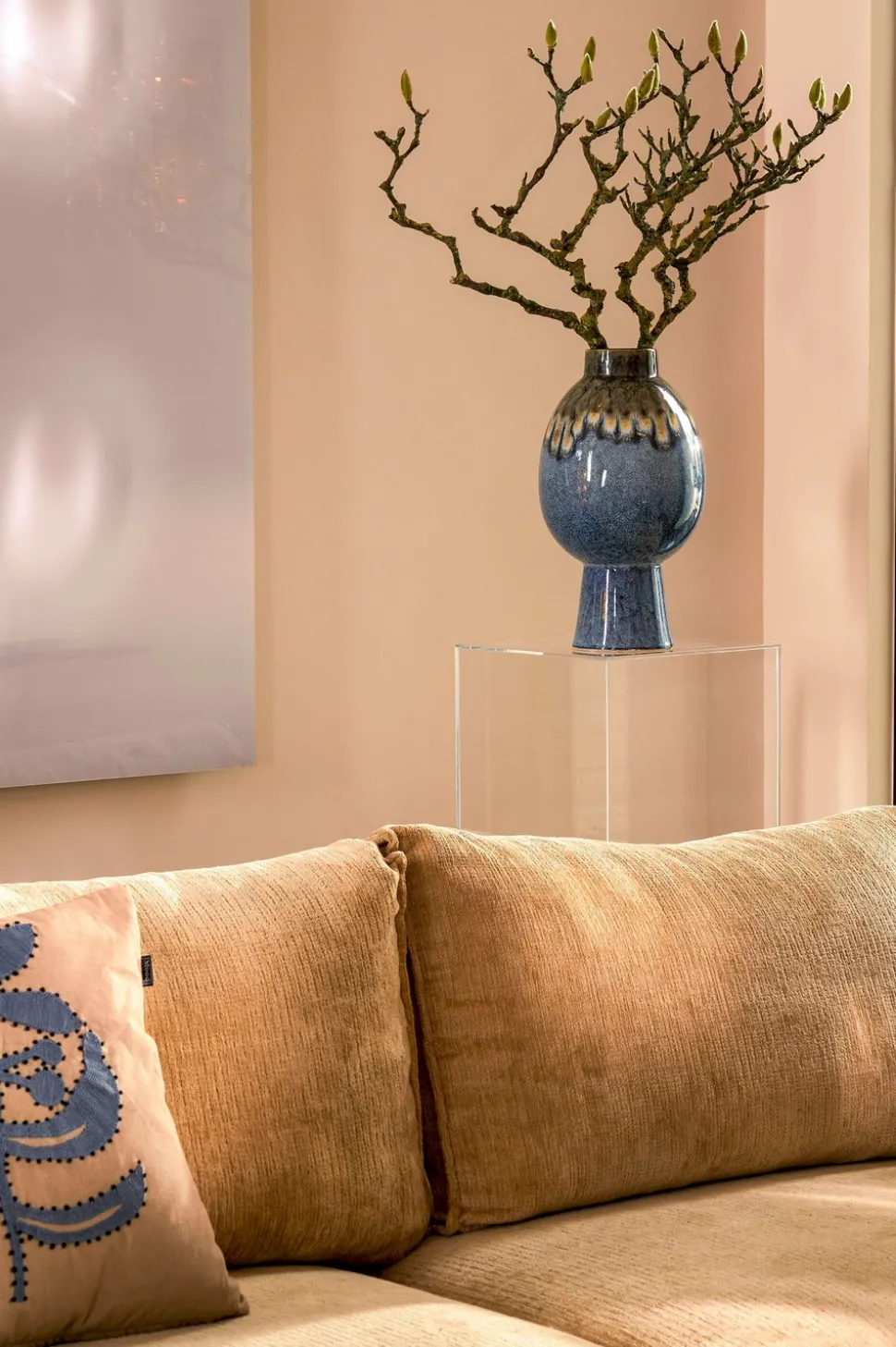 Vous cherchez un vase unique ? Le vase Helma de Mica Decorations est ce qu’il vous faut ! Le vase en céramique bleu est doté d’un magnifique détail sur le haut, avec un dégradé de couleurs ressemblant à un effet de goutte. Le vase est 100 % fait main et donc unique ! Ce vase attire l’attention par lui-même, mais il est également joli avec des fleurs ou des fleurs séchées. Cela peut se faire parfaitement par l’ouverture de 8 cm. Placez-le dans une armoire murale ouverte ou sur le rebord d’une fenêtre. Les dimensions sont H38 x Ø21,5 cm. | Attention : ce produit étant fabriqué à la main, sa couleur, sa taille et sa forme peuvent varier. De plus, les vases en céramique étant poreux, ils ne sont jamais 100 % étanches.