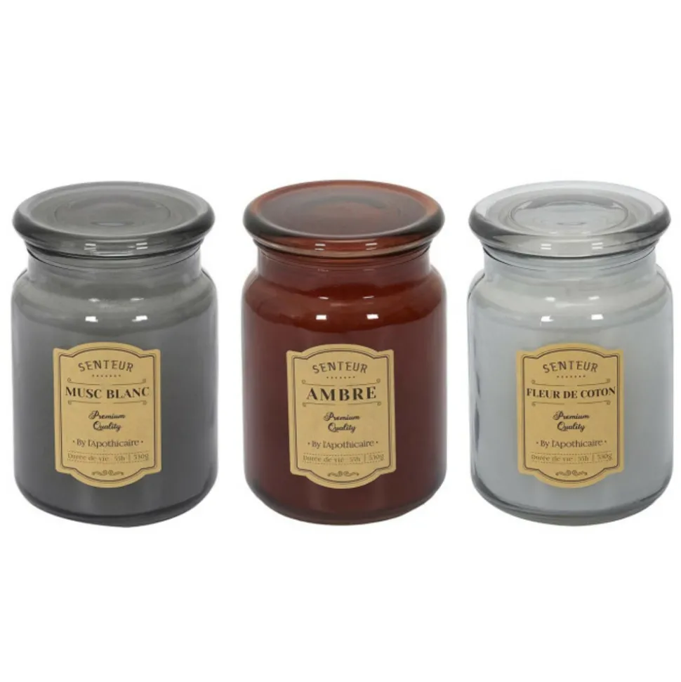 Dimensions : D. 9,4 x H. 14 cmMatières : Cire & VerreSpécificités :Tendance & DécoLot de 3 bougies parfuméesForme rondeDurée de combustion : 55 heuresSenteurs : Musc blanc, Ambre & Fleur de cotonPoids : 1,02 kgCouleur : Multicolore