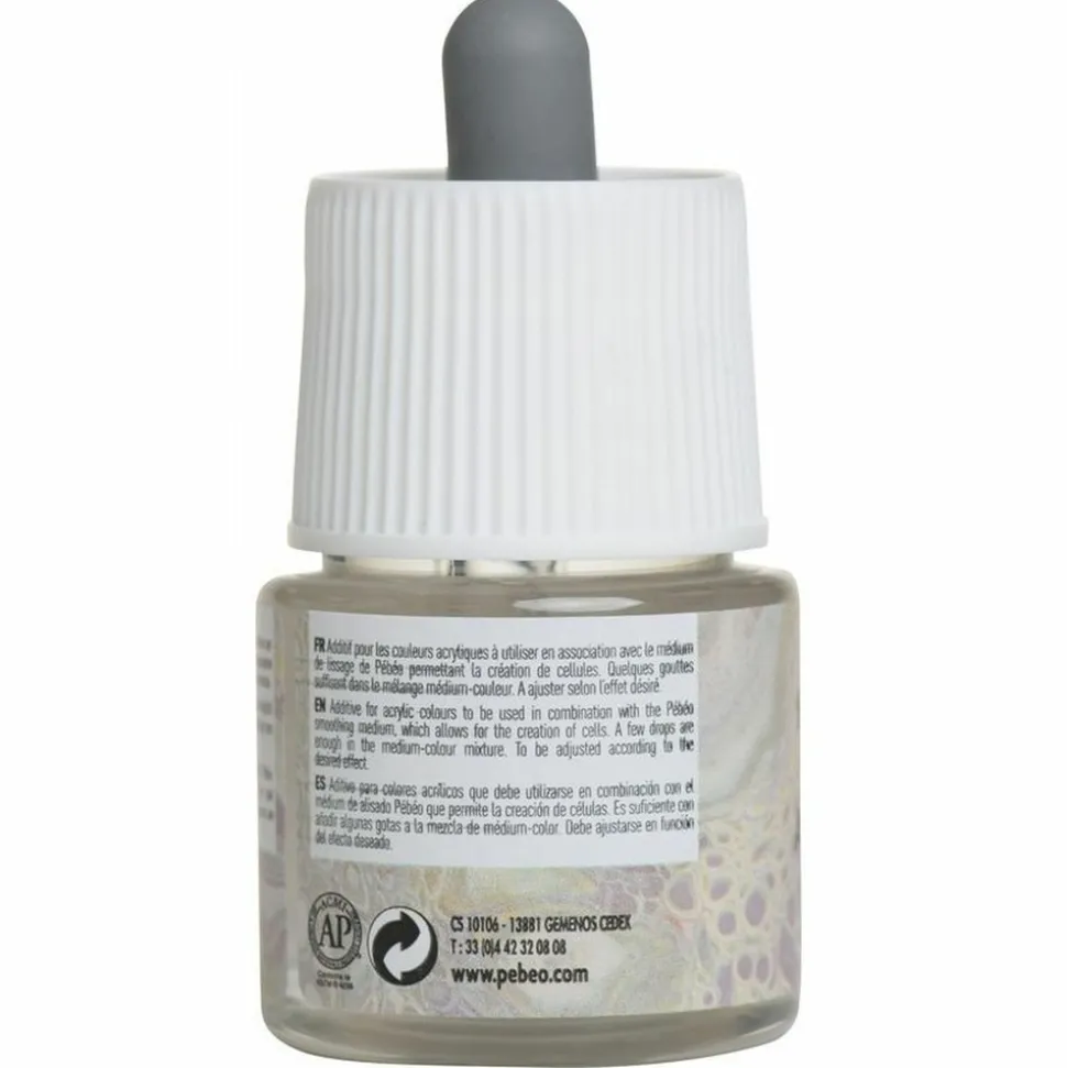 Huile de silicone pour peinture acrylique. Cet additif est à associer avec un medium de lissage afin de créer des cellules. Ajuster le nombre de gouttes en fonction du rendu souhaité (3 à 8 gouttes). Attention à ne pas abuser avec la quantité de silicone, cela pourrait faire des « trous » dans votre peinture. 2 flacons de 45 ml.