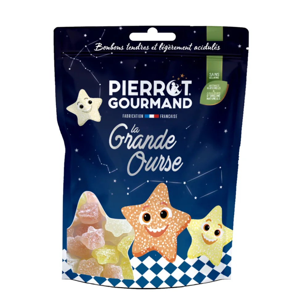 Avec les bonbons étoiles « La Grande Ourse », redécouvrez les plaisirs d’une constellation de saveurs fruitées : pêche, fruit exotique, citron et passion. Sans gélatine et élaborés en France avec des arômes et colorants naturels, ces bonbons moelleux offrent un goût intense. Le sachet refermable préserve leur fraîcheur… enfin, si vous arrivez à le fermer avant la dernière bouchée. Ces bonbons sont parfaits pour combler les petits creux ou les soirées ciné placées sous le signe des étoiles ! Sachet de bonbons ‘La Grande Ourse’, saveurs fruitées – 100g.