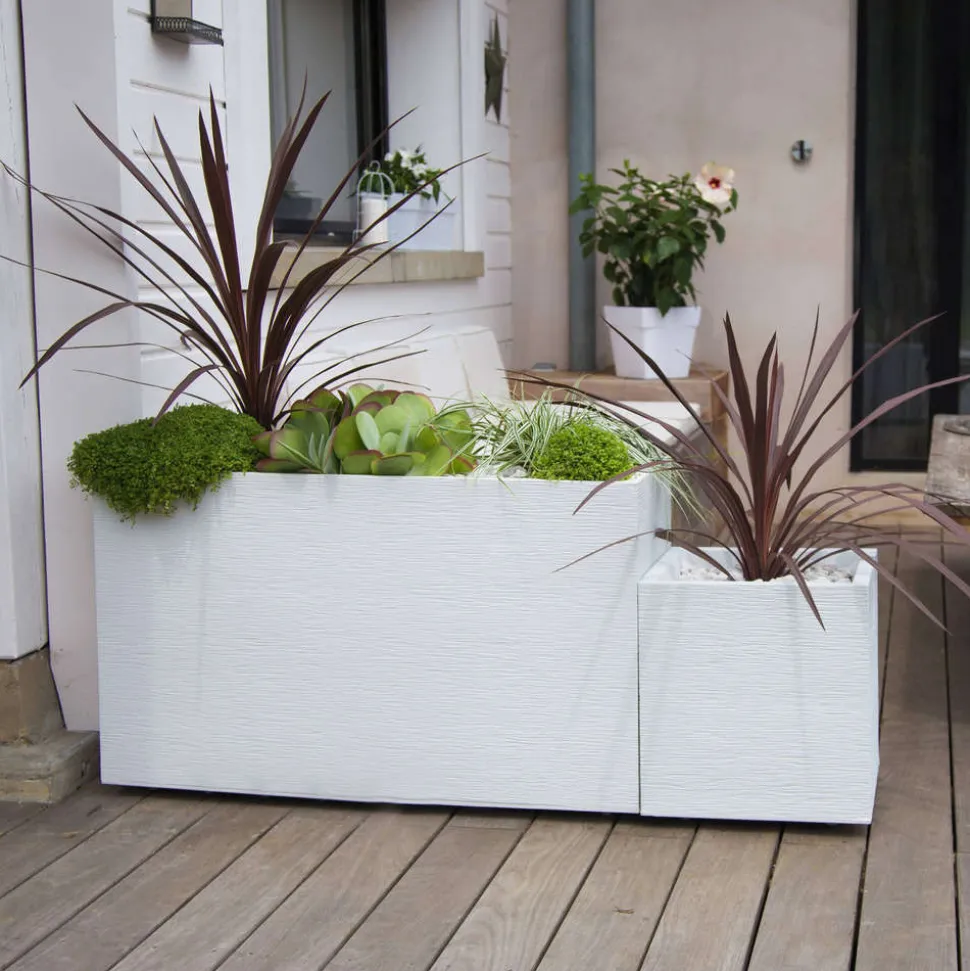Le pot Graphit présente un look moderne impeccable avec ses lignes géométriques et ses angles droits parfaits. Il est en polypropylène de couleur blanc mat, résistant aux UV et au gel. La surface extérieure de ce grand pot présente un aspect strié élégant et design tandis que l’intérieur lisse est facile à nettoyer. Les différents bacs et pots de la gamme sont facilement modulables entre eux, ce qui vous permet de personnaliser votre espace extérieur à volonté et selon vos envies.