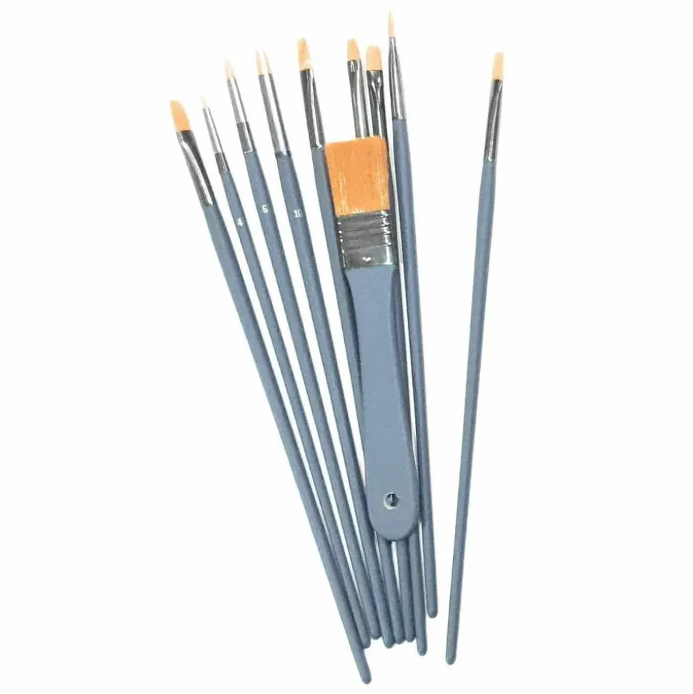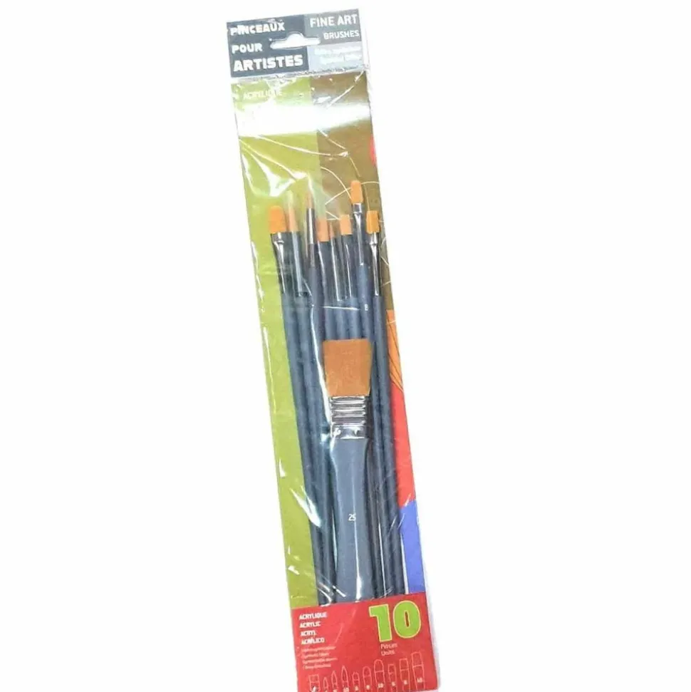 Set de 10 pinceaux de différentes tailles et fonctions pour peintures acrylique permettant de couvrir de larges possibilités, contient un splater pour travailler le fond, 3 pinceaux ronds pour les détails et les finitions, 3 pinceaux usés bombés pour les modelés et glacis et 3 pinceaux plats pour le travail des surfaces, un set idéal pour vous accompagner dans la plupart de vos projets ! Le spalter est un pinceau plats. Il est composé d’une brosse large surmontée d’une virole et d’un manche. La touffe de la garniture est réalisée à partir de fibres de soies naturelles comme la soie de porc ou en fibres synthétiques.