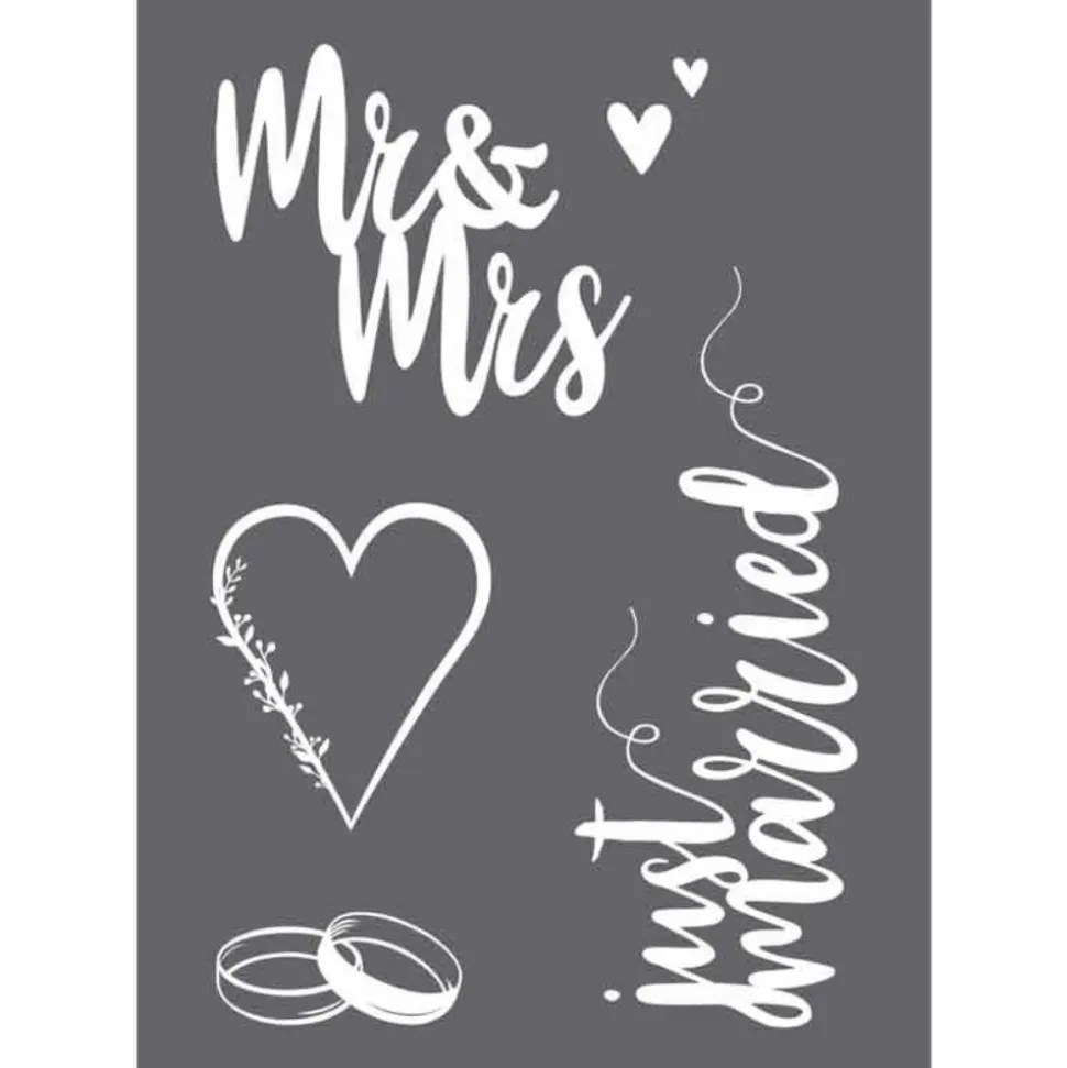 Pochoir en tissu sur le mariage mesurant 29,7 x 21 cm avec spatule, il contient un cœur des alliances et des phrases de mariage, il se compose de plusieurs mots de cœurs et de flèches, le pochoir adhère sur de nombreux supports comme le textile, le bois, le papier, le béton et la terre cuite, Il est recommandé d’utiliser de la peinture pour sérigraphie lors de votre création en mercerie