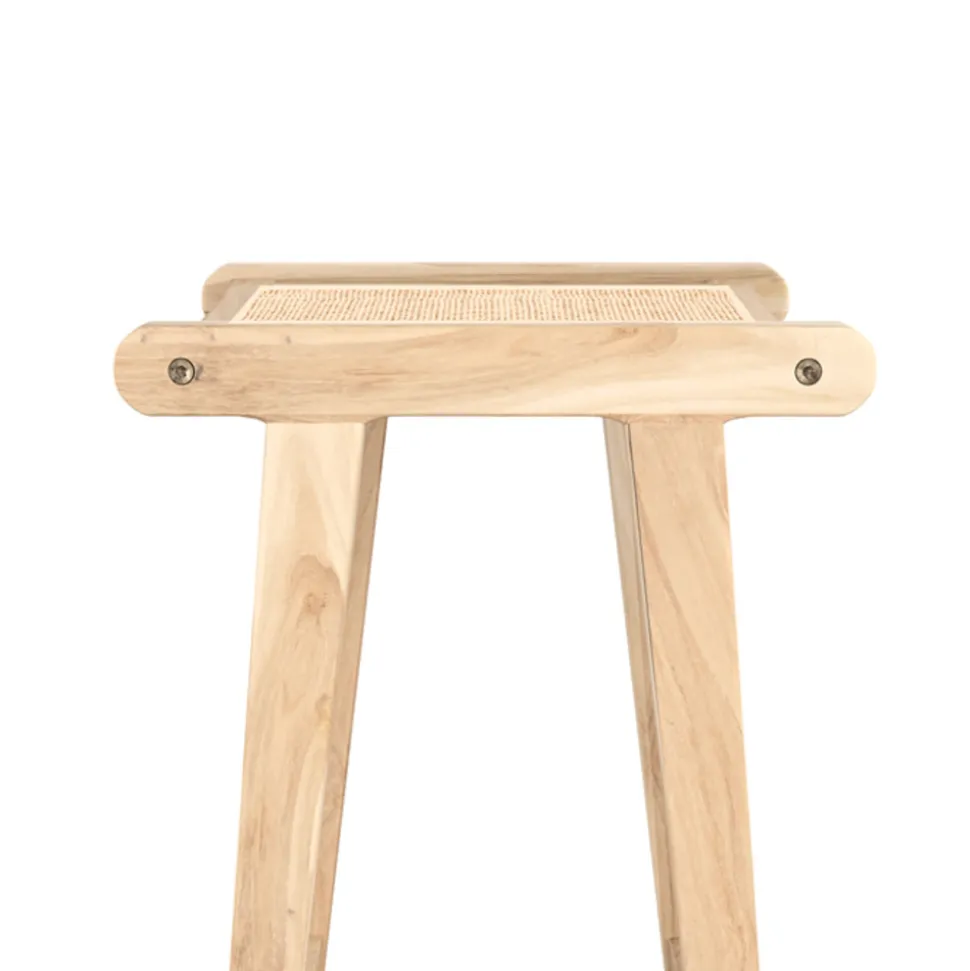 Réalisé en bois de teck massif, ce tabouret se distingue par un piètement traineau très stable et deux repose-pied. L’assise en rotin participe à l’esthétique épurée de ce siège coup de cœur. On a envie d’en profiter sur un balcon, une terrasse ou un patio.