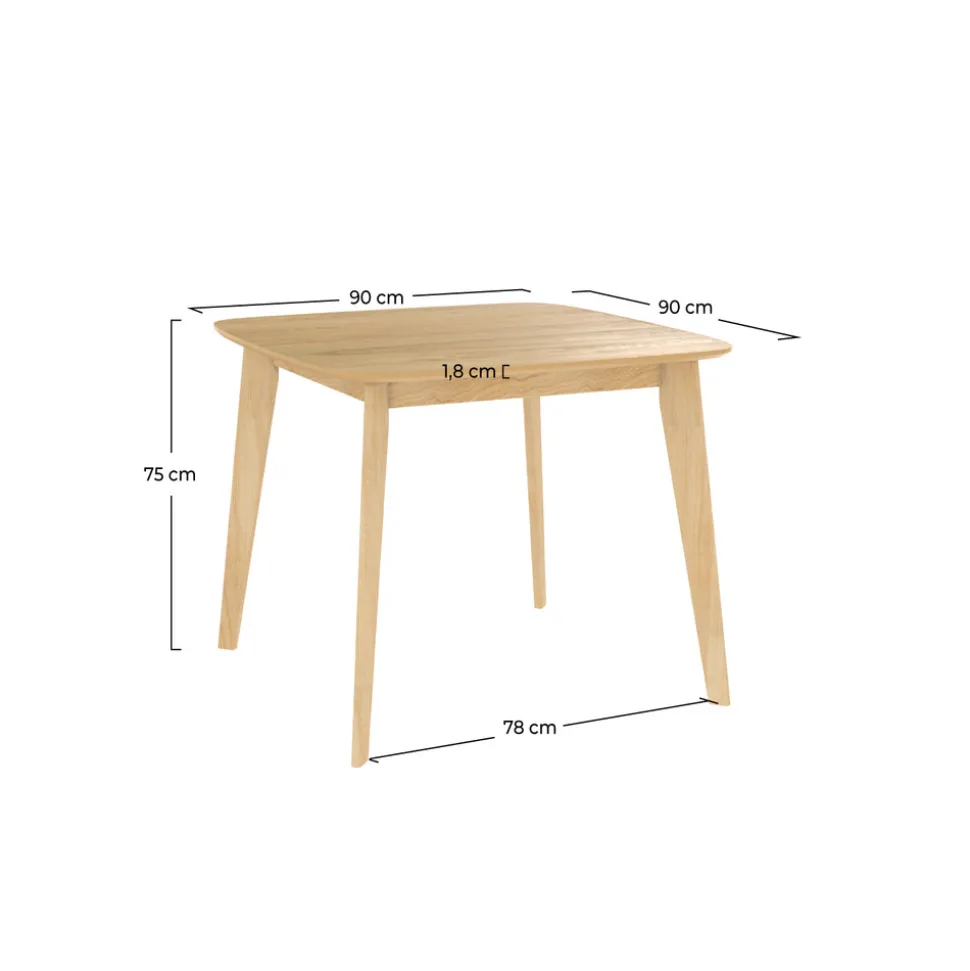 Avec ses dimensions confortables L 90 x P 90 cm, notre table carrée Julio 90 cm en bois clair peut accueillir 4 personnes autour de son plateau. Parfaite pour partager des repas dans votre pièce à vivre ou cuisine.
