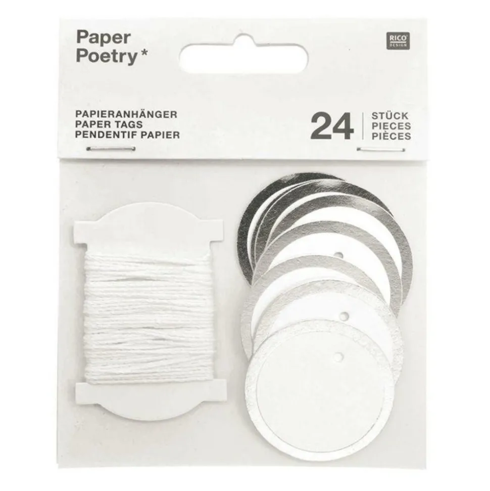 24 pendentifs ronds blancs. Customisez ces pendentifs et accrochez-les sur un sac, une trousse, un cadeau … pour les personnaliser !