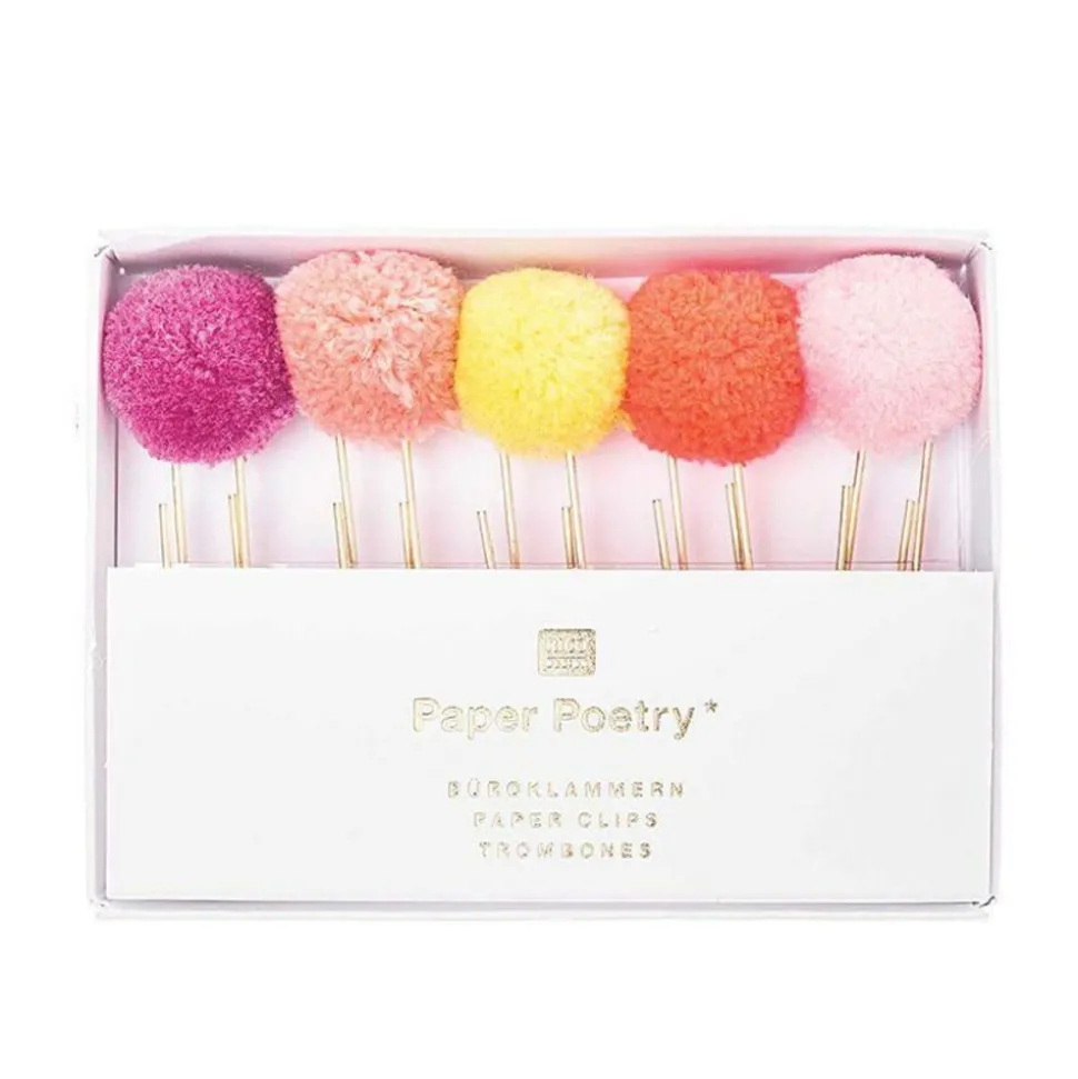 Ces 5 trombones à pompon vous permettront d’accrocher vos notes dans votre agenda ou de marquer une page que vous souhaitez noter! Ce set contient 5 trombones dorés avec chacun un pompon aux couleurs fluos. Dimensions d’un trombone : 5 x 1 cm. Couleurs des pompons: Rose, rose fluo, jaune, vieux rose, prune.